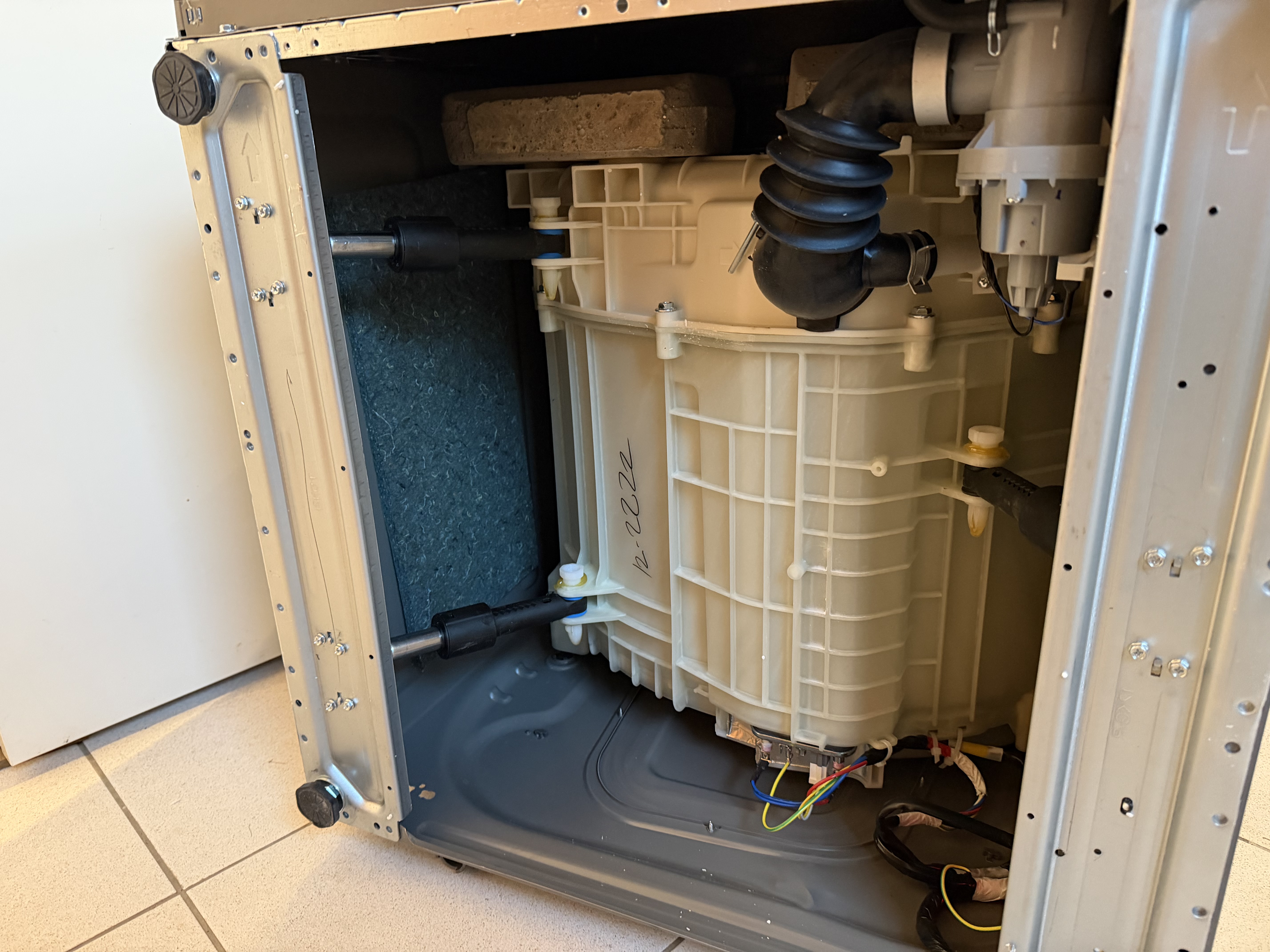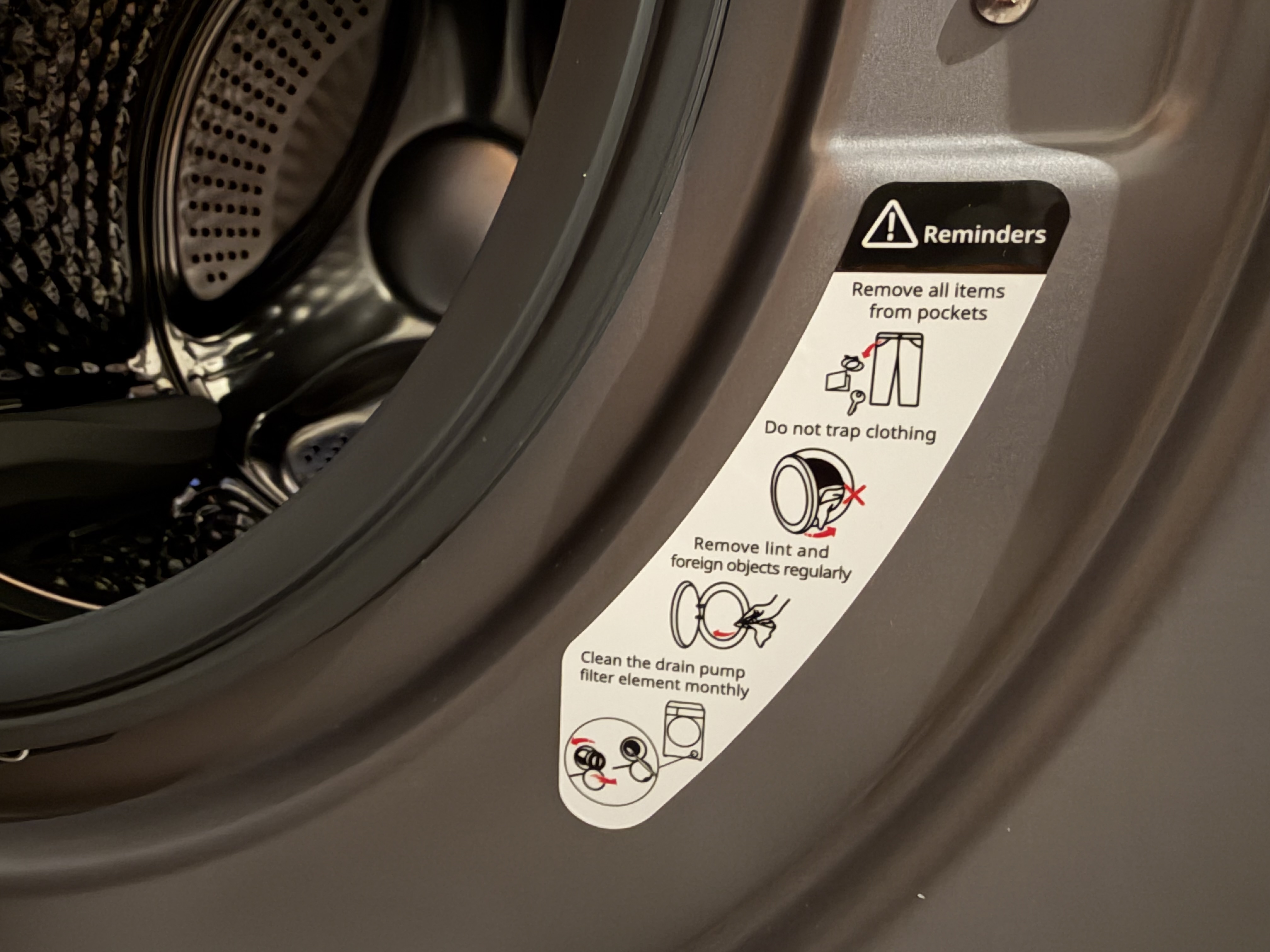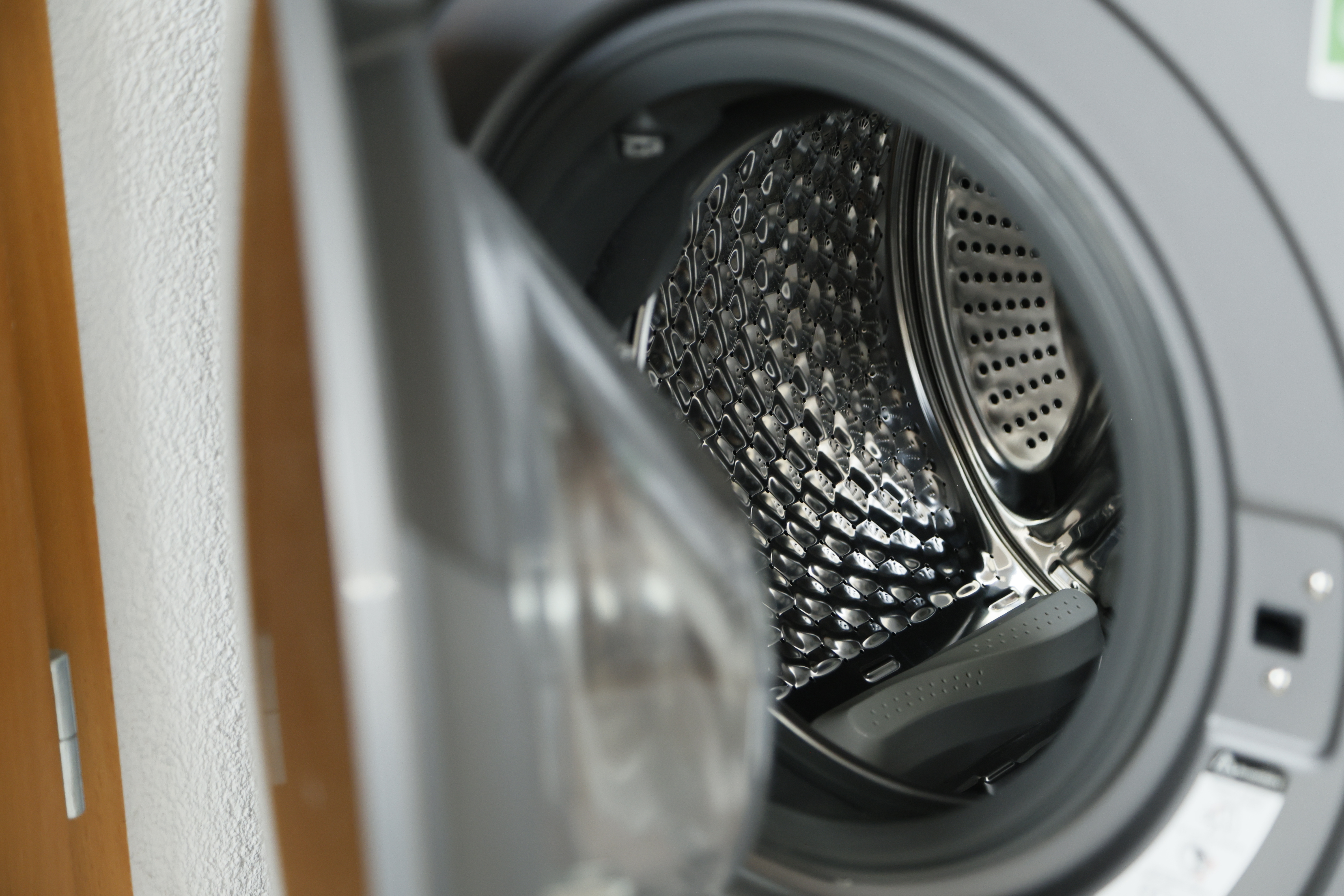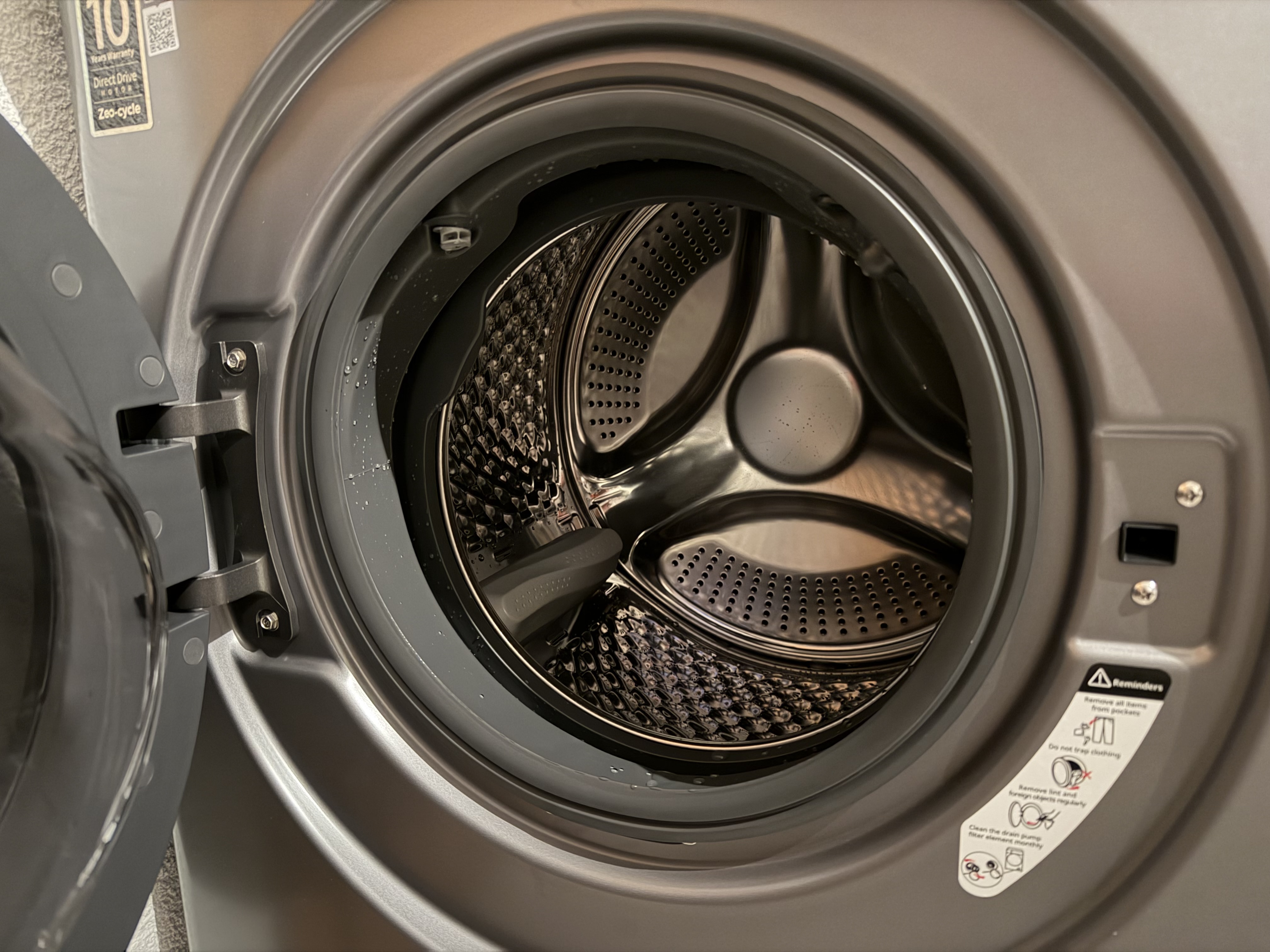 Trotz des Fassungsvermögens bleibt das Gerät kompakt. Mit 59,5 × 68,2 × 85 cm fällt der Waschtrockner moderat aus und wirkt weder wuchtig noch schwerfällig. Die Trommel ist sauber verarbeitet, mit abgerundeten Kanten und textilschonender Struktur – ein Pluspunkt im Alltag. Beim Befüllen zeigt sich, dass die Maschine ihre Kapazität gut nutzt und kaum beengt wirkt.