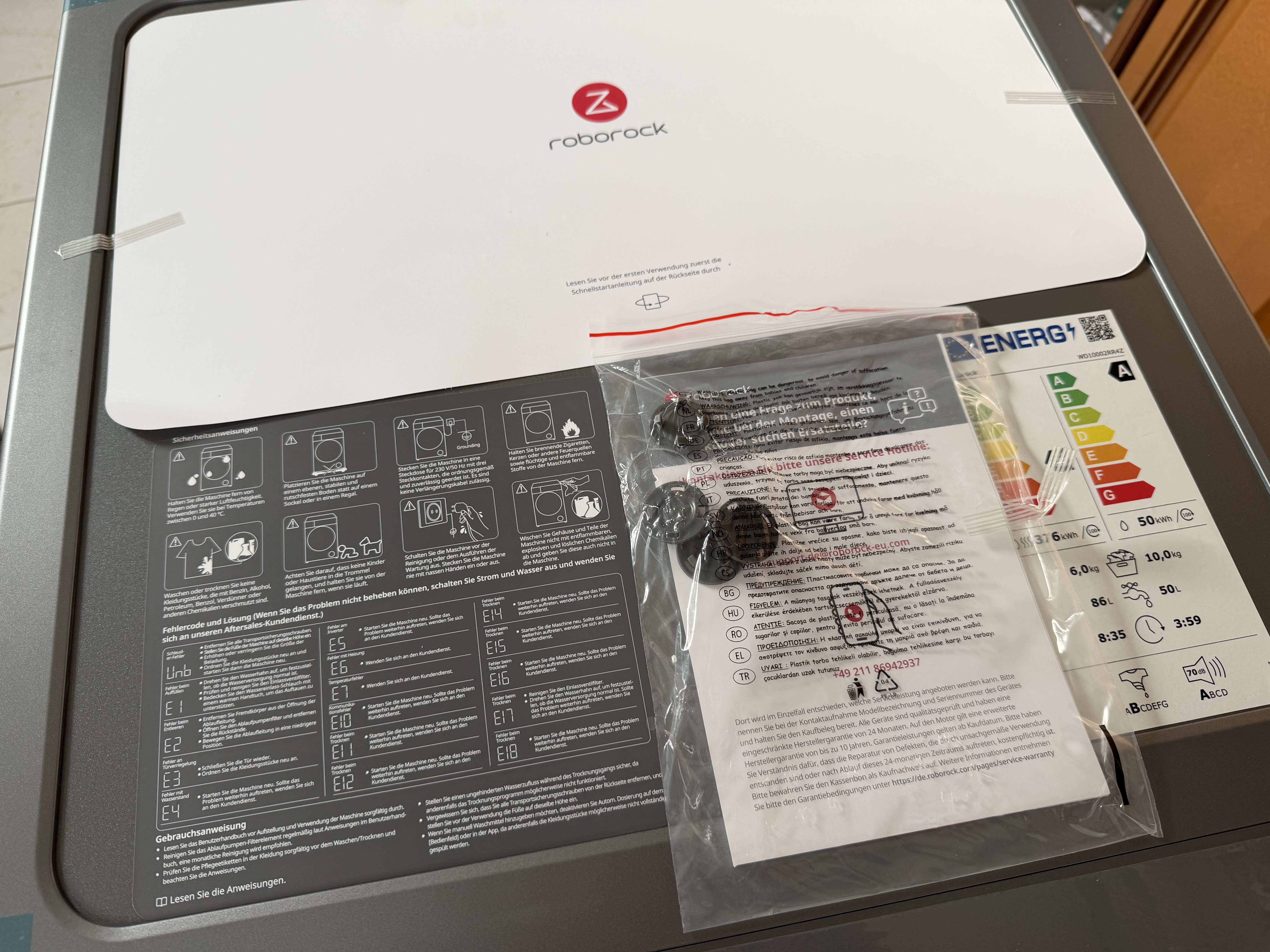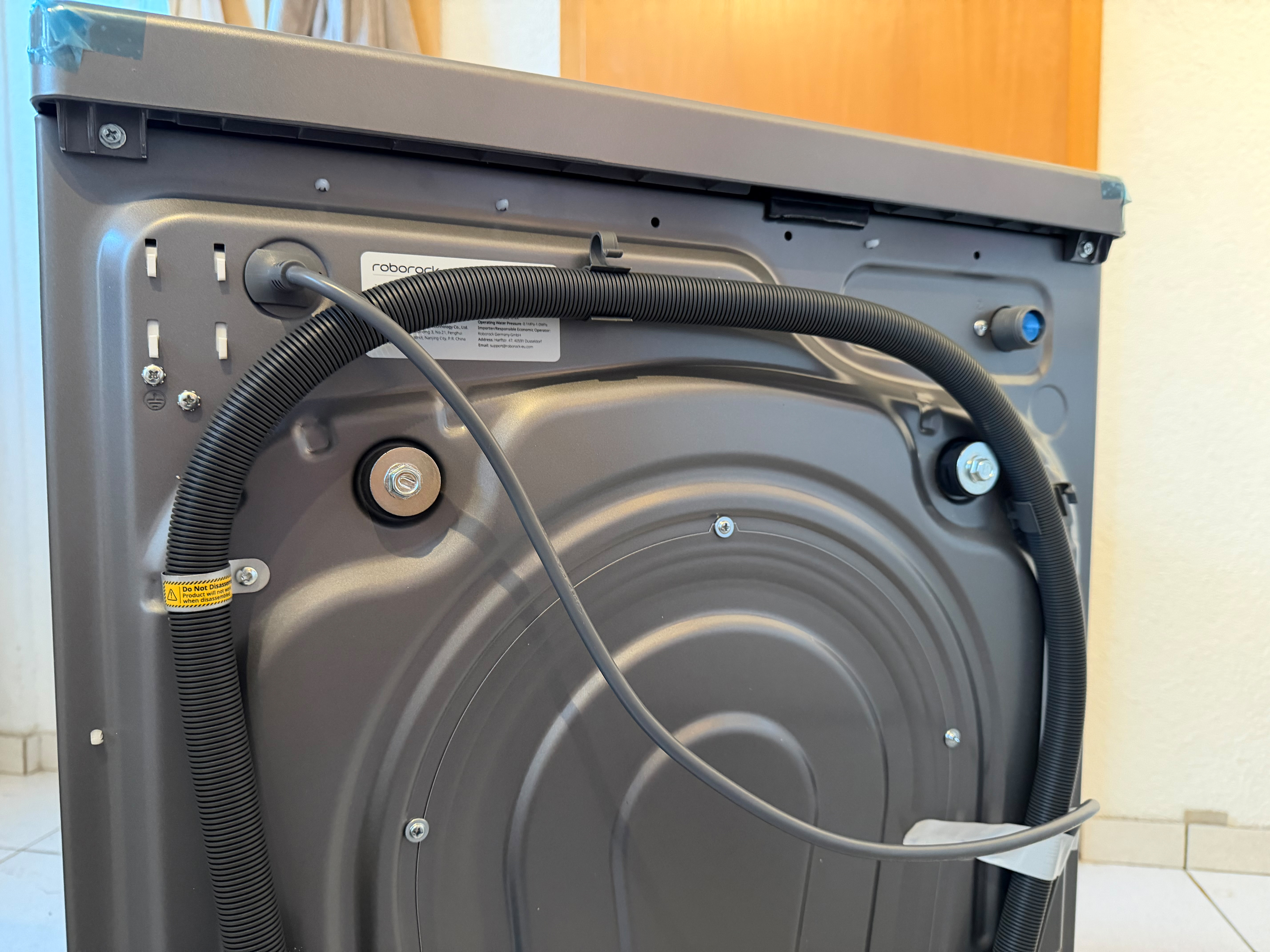 Der Aufbau des Roborock Zeo Lite verläuft unkompliziert und ist in wenigen Schritten erledigt: Zulauf- und Ablaufschlauch anschließen, Transportsicherungen entfernen, Stecker einstecken – schon ist das Gerät einsatzbereit. Die beiliegenden Werkzeuge und die gut strukturierte Schnellanleitung erleichtern besonders Einsteigern die Installation. Auf der Maschine selbst finden sich zusätzliche Aufkleber mit Hinweisen, die jedoch meist in englischer Sprache gehalten sind.
