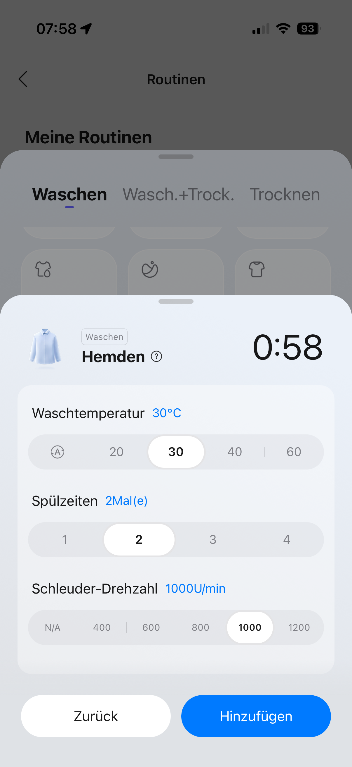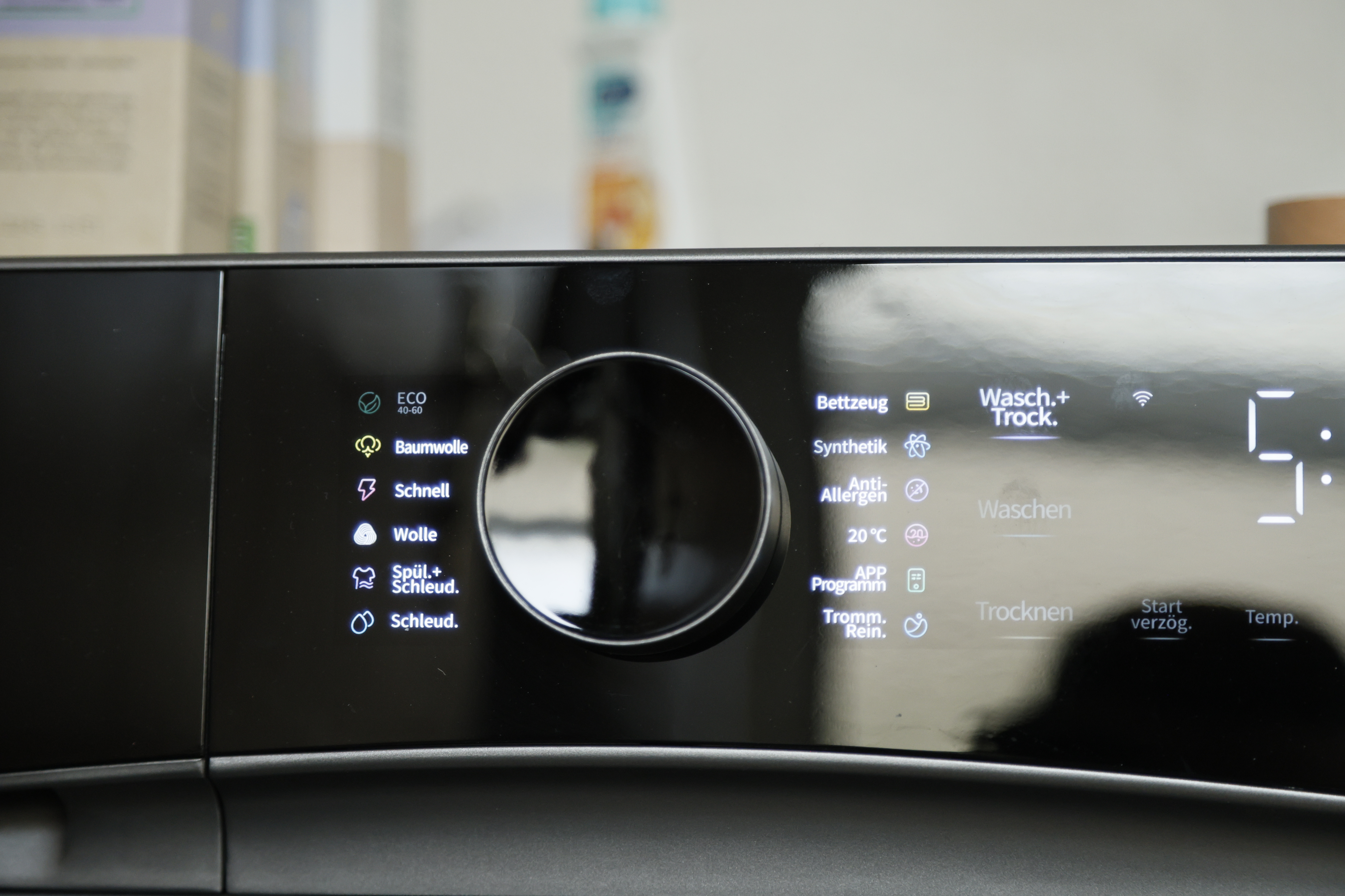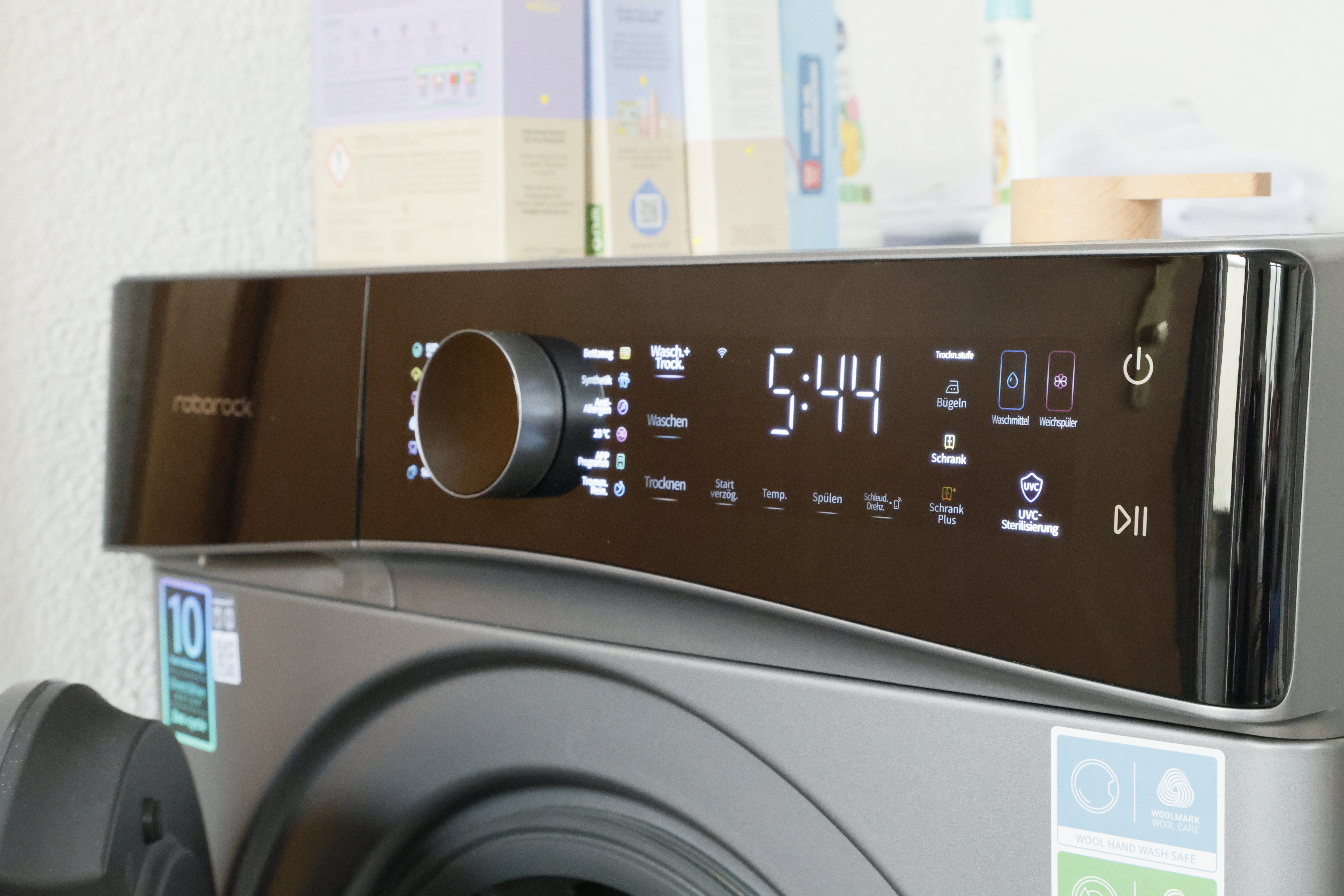 Die Bedienung des Roborock Zeo Lite ist übersichtlich und logisch aufgebaut. Über das Drehrad wird das Grundprogramm gewählt, über das Touchdisplay die Betriebsart – Waschen, Trocknen oder beides kombiniert. Ohne App bleibt der Funktionsumfang allerdings eingeschränkt: Spezialprogramme wie für Babykleidung, Sportkleidung, Seide, Hemden oder das Intensivprogramm lassen sich nur per App aktivieren oder als Favoriten hinterlegen.