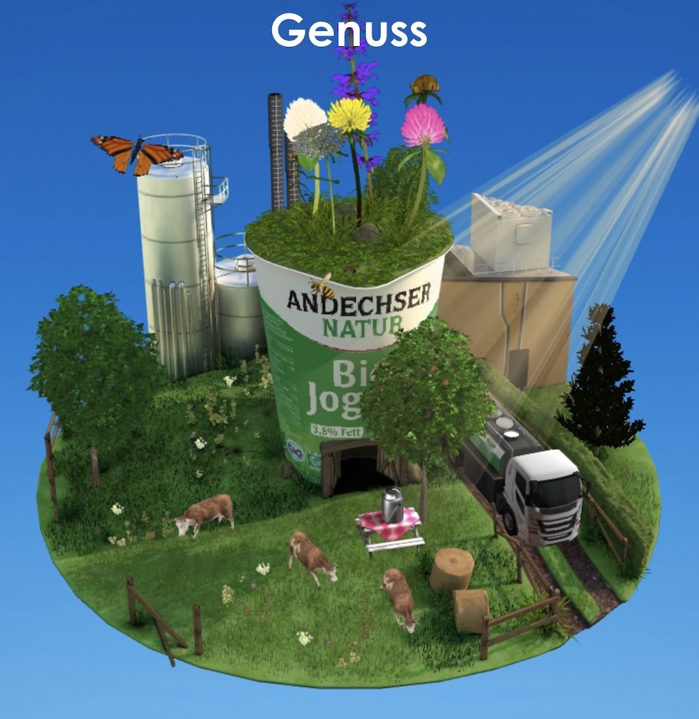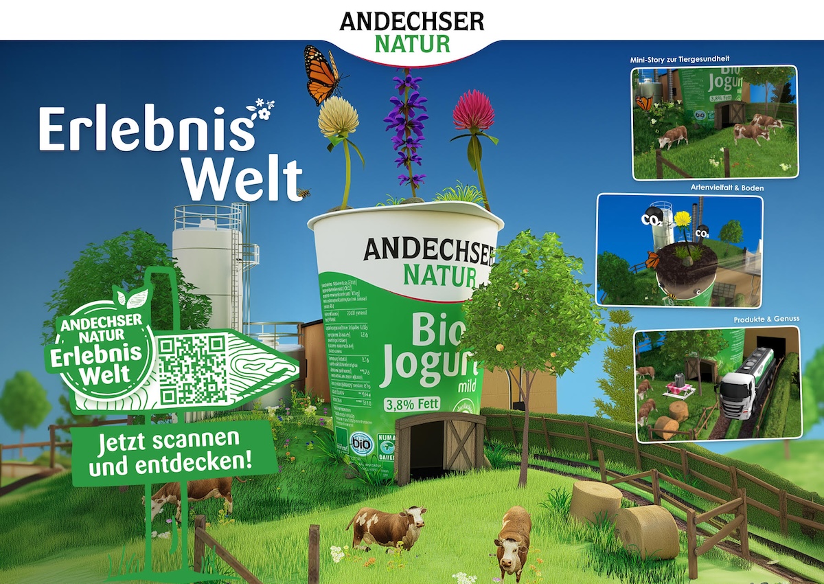 Vom Joghurt-Becher ins World Wide Web: Curious Company hat für Andechser Natur, alteingesessener Bioprodukt-Anbieter aus Bayern, eine 3D-Erlebniswelt entwickelt. Direkt in sie hinein führt ein QR-Code auf den Andechser-Produkten.