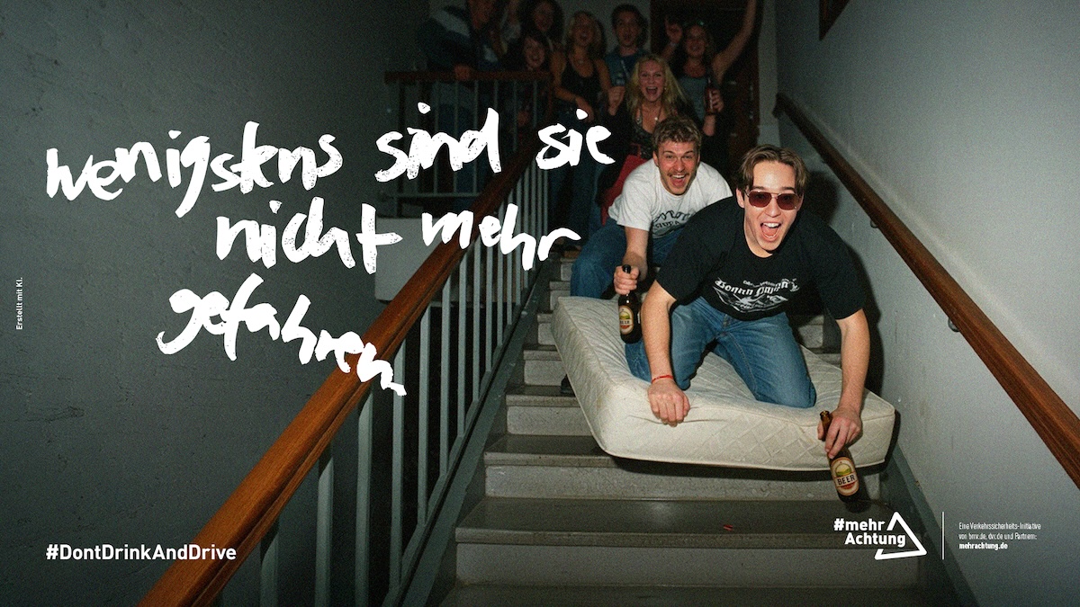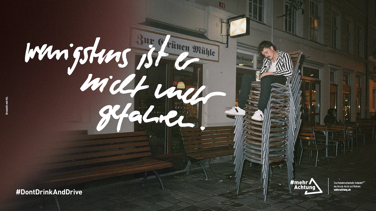 Darüber hinaus wird die Kampagne auch auf den Social-Media-Kanälen von #mehrAchtung und deren Partnern ausgespielt – und appelliert daran, dass, sobald Alkohol im Spiel ist, das Auto, E-Scooter, Rad und Roller stehen bleiben.