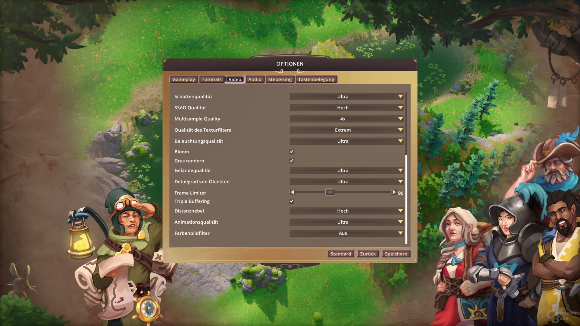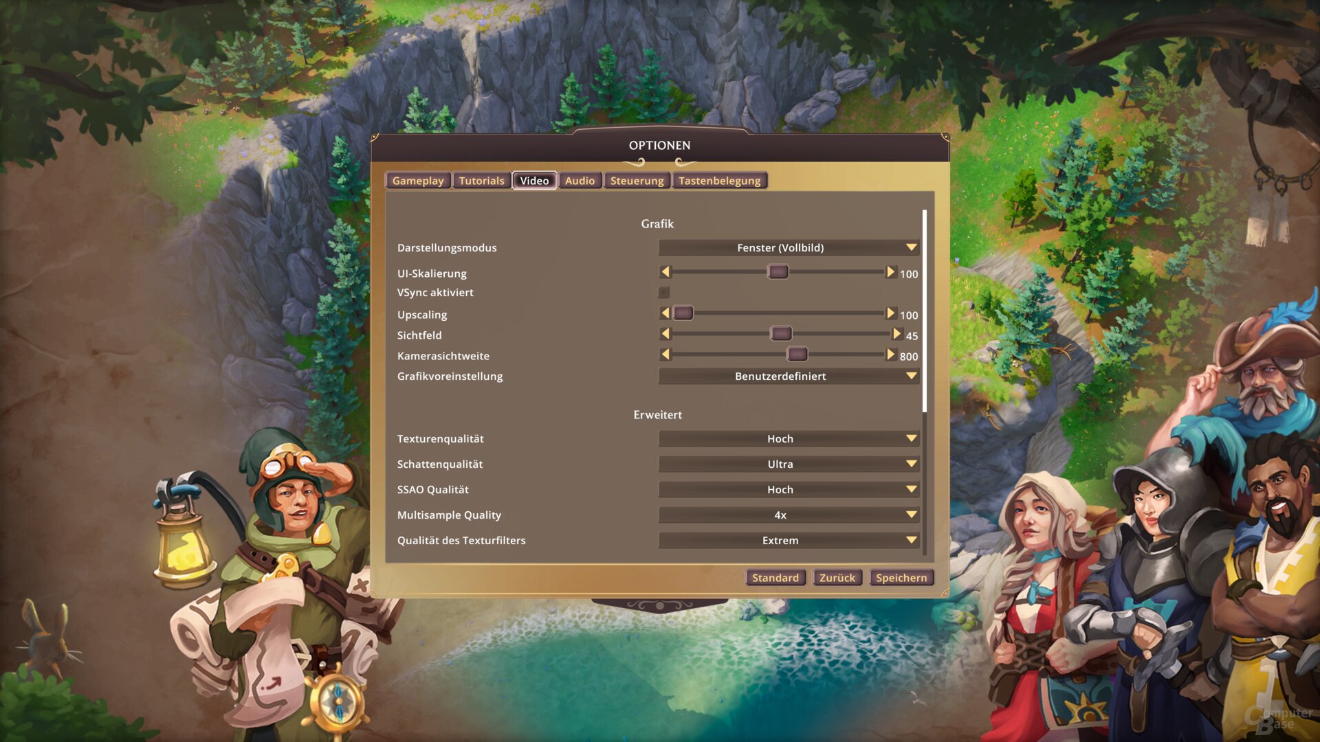 Stattdessen nutzt das Spiel die aus der Mode gekommene MSAA-Kantenglättung, die zwar viele Ressourcen frisst, mit dem Grafikstil des Spiels aber gut harmoniert. Moderne, detaillierte Spiele sind mit MSAA, wenn dieses irgendwann mal unterstützt wird, eine reine Flimmerorgie. Pioneers of Pagonia ist das aber eben nicht. Mit 4×MSAA ist das Bild auch in WQHD ziemlich stabil. Es ist nicht perfekt, aber im Spielgeschehen völlig unauffällig. Was dann schon unterstützt wird, ist FSR 1, da es sich um ein räumliches Verfahren handelt, das nur auf den aktuellen Frame angewendet wird. Es ist aber nicht ratsam, FSR 1 zu nutzen, um die Performance zu verbessern. Denn bereits bei kleinen Skalierungsfaktoren wird das Bild sichtbar unscharf.