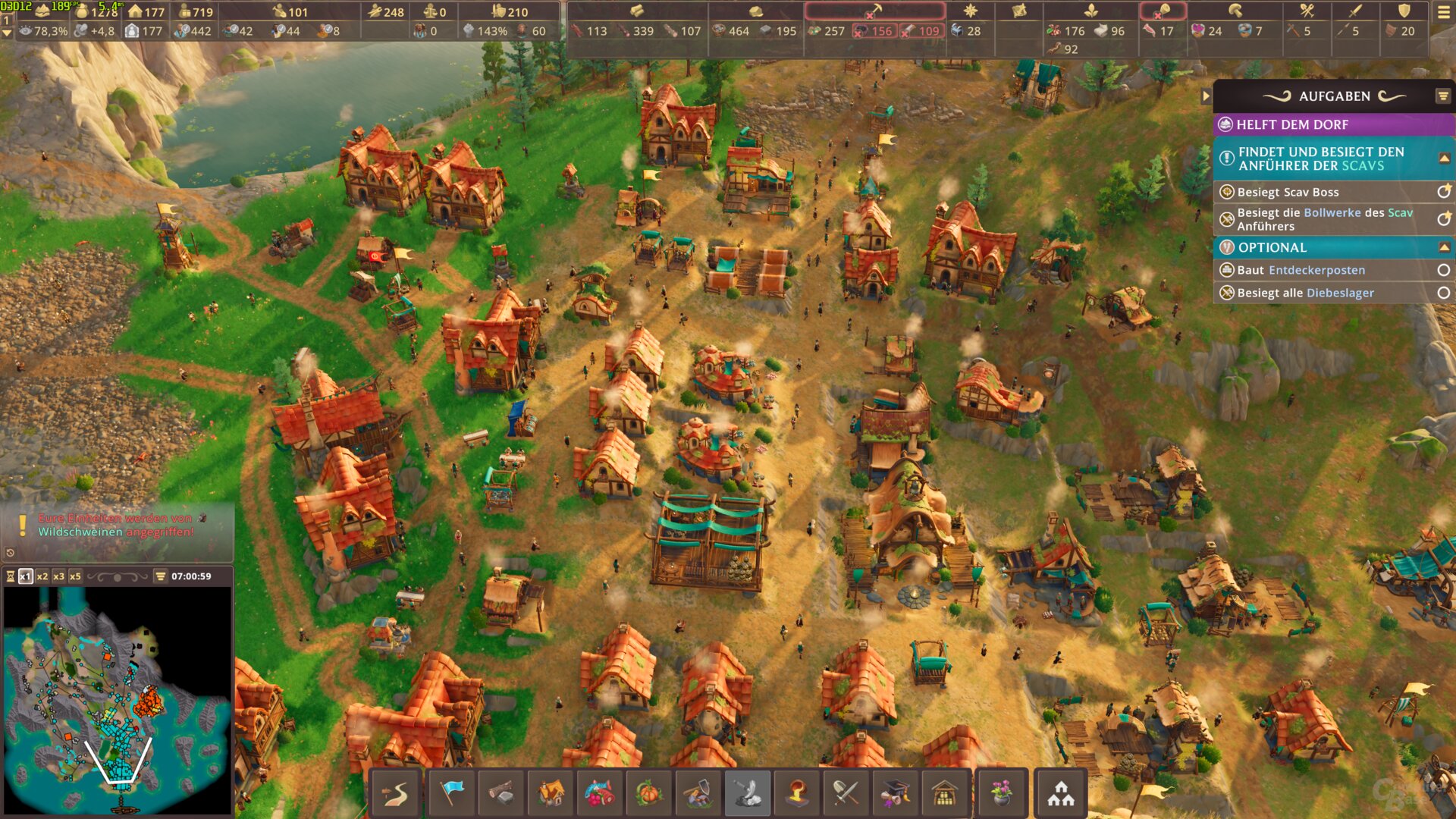 Technisch hat Ubisoft mit Die Siedler: Neue Allianzen natürlich völlig andere Mittel und Wege als das kleine Entwicklerteam von Envision ohne einen Publisher im Rücken. Optisch ist Pioneers of Pagonia entsprechend simpel gestrickt. Die hauseigene Engine vermag es aber trotzdem, die Spielwelt in einem Zeichenstil liebevoll darzustellen. Und stellenweise auch ziemlich detailliert darzustellen, die zahlreichen Animationen der verschiedenen Siedler – sorry, Pagonier – machen viel Spaß. Und mit den hunderten, teils tausenden Figuren in der Spielwelt kommt auch definitiv der „Wuselfaktor“ auf. Ja, auch das Wort muss bei dem Spiel einfach gesagt werden.