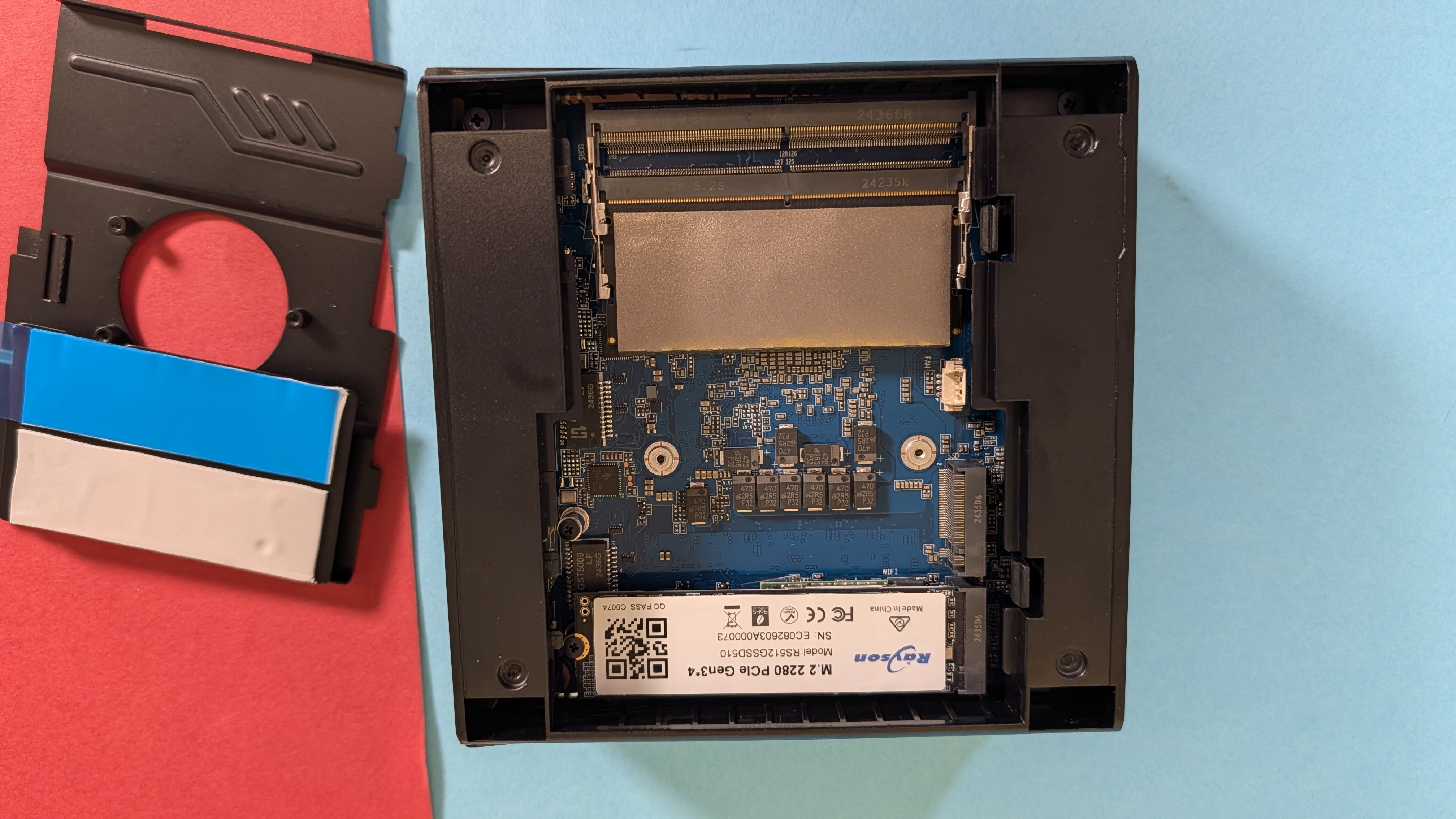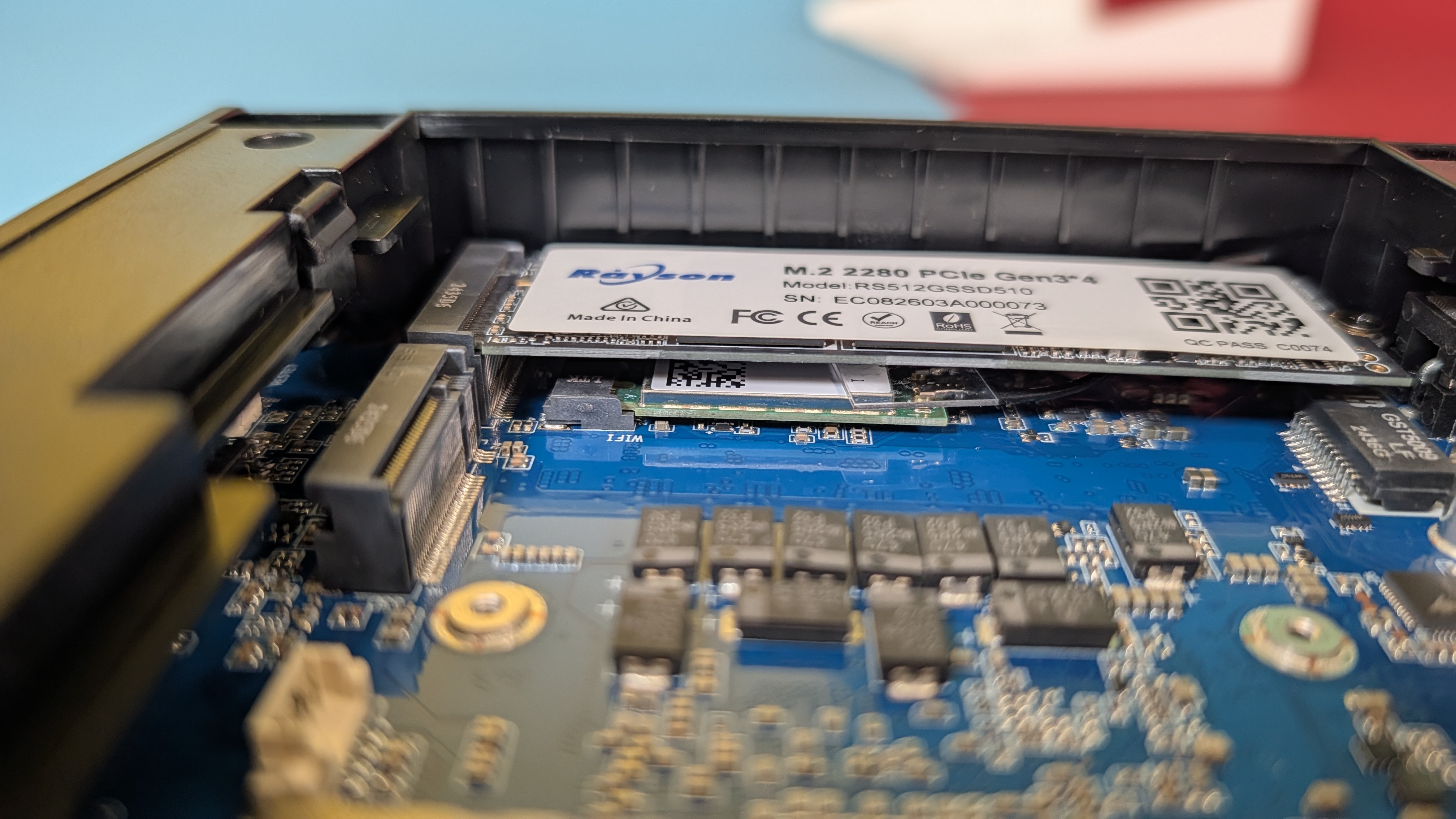 Die Chuwi UBox CWI604 kommt mit einem einzelnen, 16 GB großen SO-DIMM-Modul an DDR5-RAM mit 4800 MT/s. Ein weiterer Port ist frei, sodass man direkt nachrüsten kann. Allerdings wäre ein Dual-Channel-Betrieb durch zwei Module ab Werk der Systemleistung sicher zuträglich gewesen. Als SSD kommt ein 512 GB großes NVMe-Modell im Formfaktor M.2-2280 von Rayson zum Einsatz. Laut Crystaldiskmark schreibt sie mit 2703 MB/s und liest mit 3272 MB/s. Das sind ordentliche Werte, insbesondere für einen vergleichsweise günstigen PC. Daneben gibt es noch einen zweiten M.2-2280-Slot.
