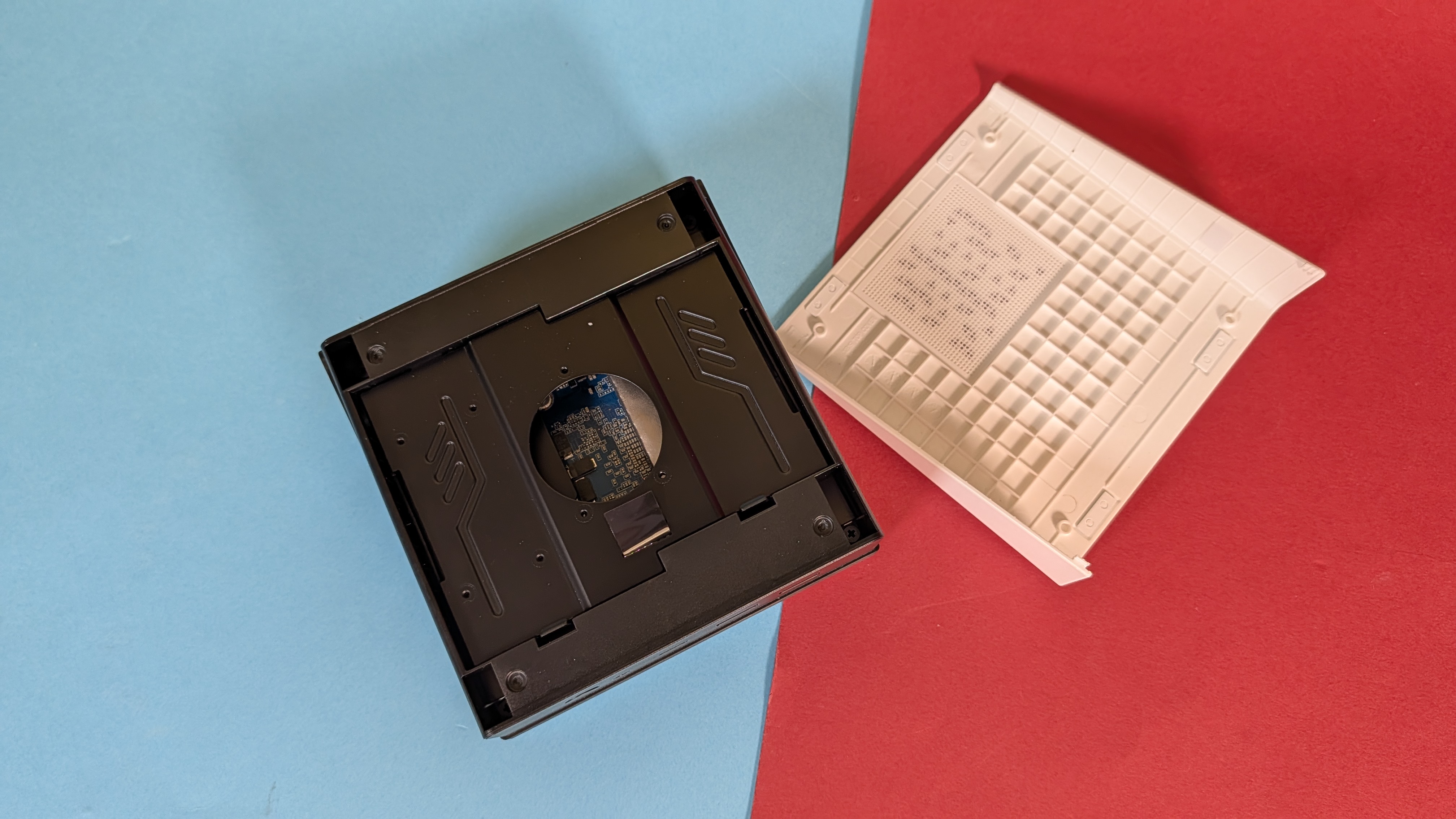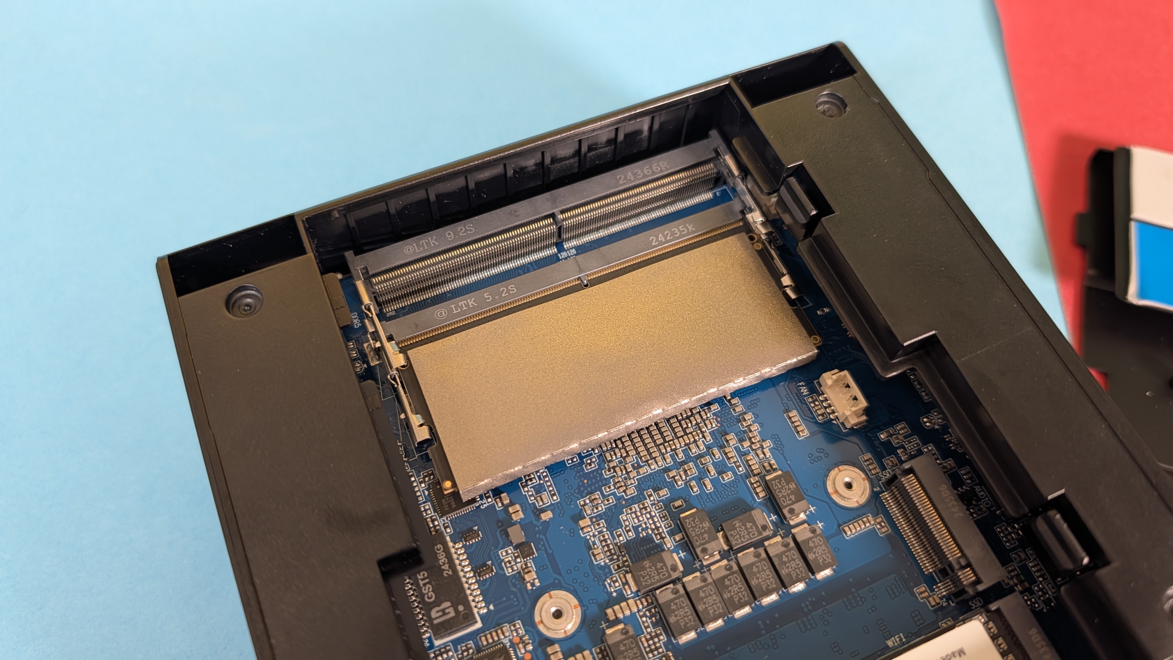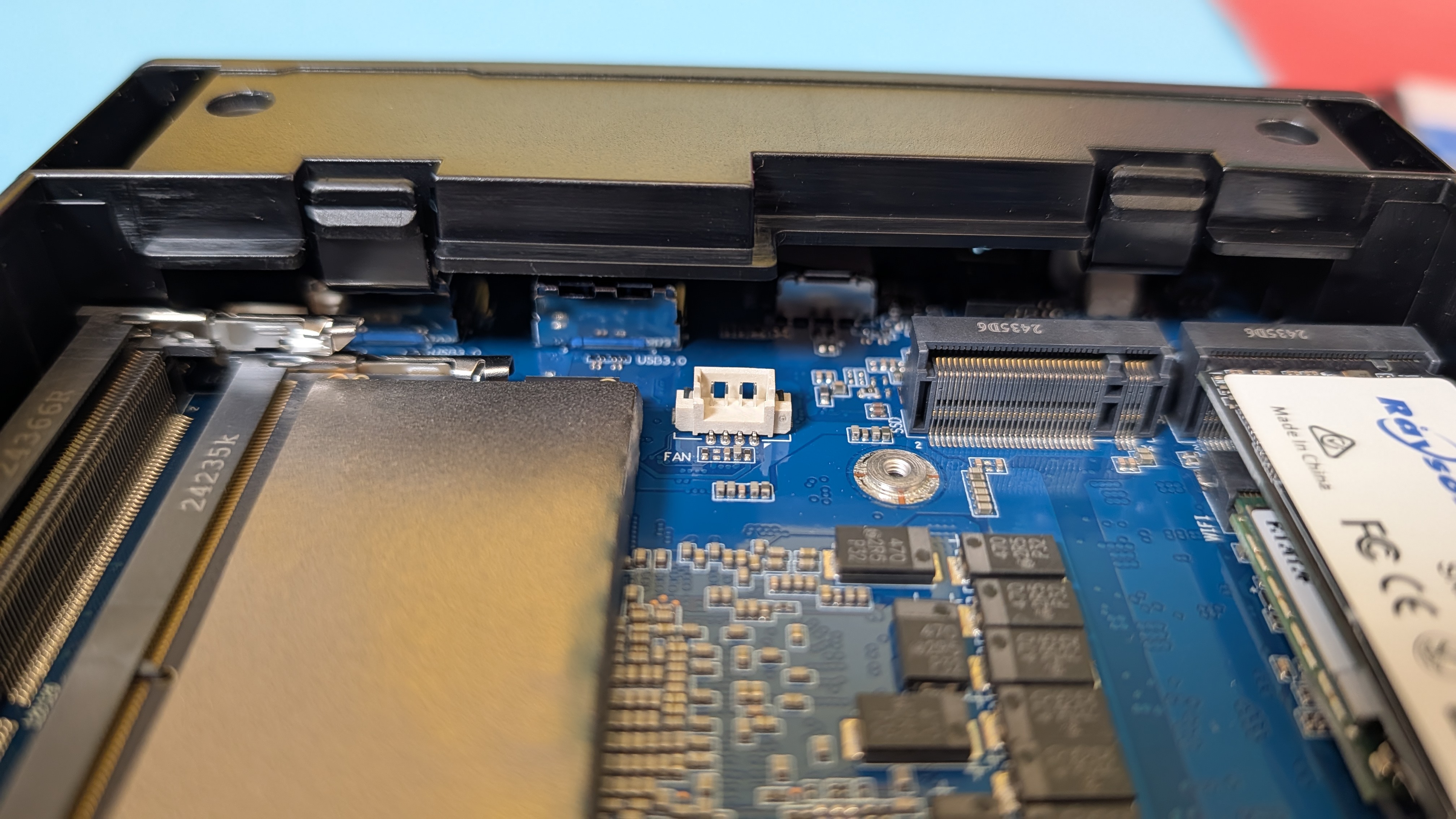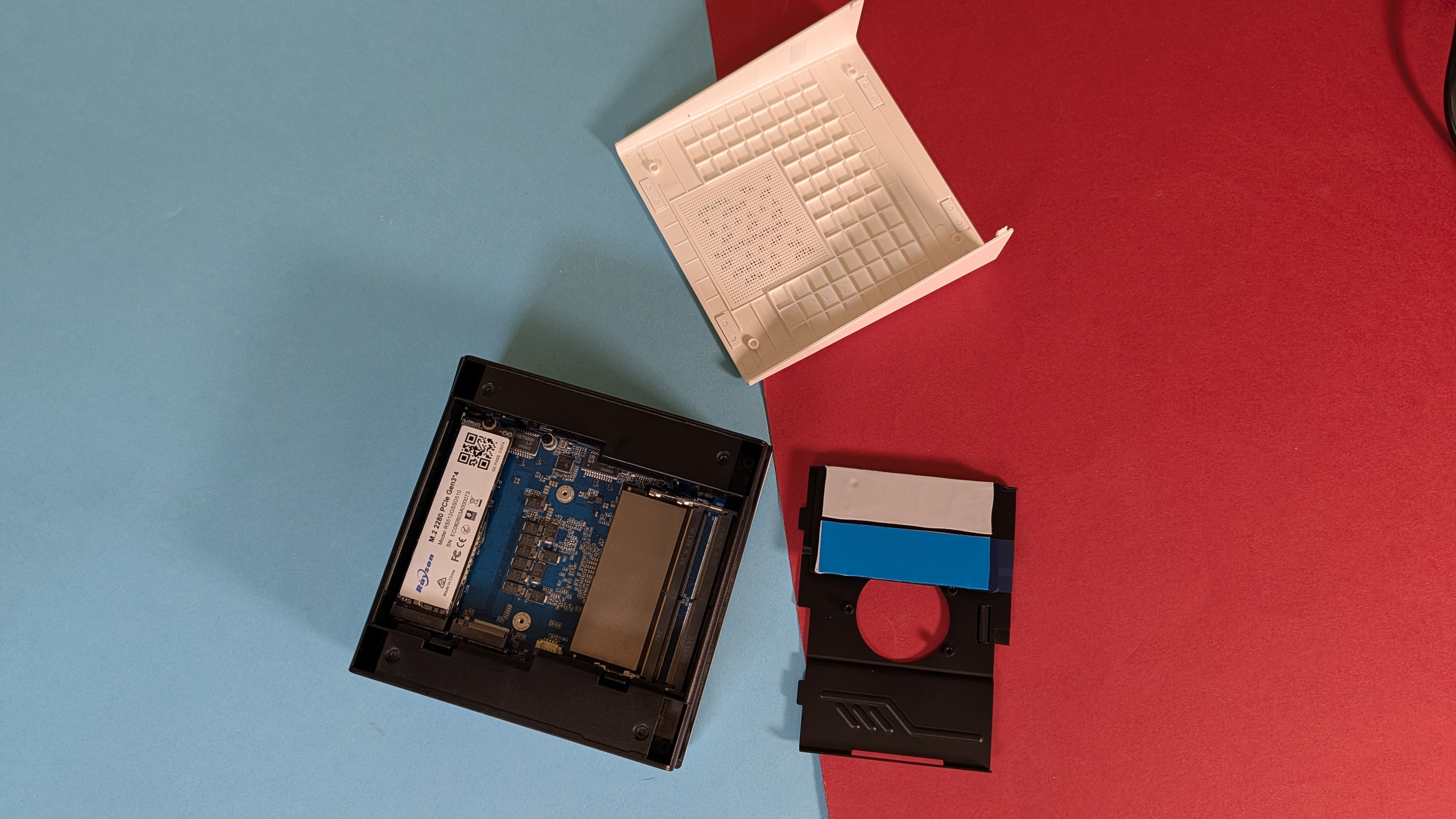 Die Chuwi UBox CWI604 ist vollständig aus schwarzen und weißen Kunststoff gefertigt, die Verarbeitung ist in Ordnung, teils sind Kanten aber etwas unsauber. Gerade auf der Unterseite wirkt das Material beim Lüftergitter etwas dünn und lässt sich leicht eindrücken. Die obere Hälfte ist lose im Gehäuse eingehakt und löst sich bereits beim Hochnehmen des Mini-PCs. So fällt dieser direkt wieder zu Boden und man hat nur den Deckel in der Hand. Das ist ungeschickt und hätte besser gelöst werden können. Auf diese Weise gelangt man aber schraubenlos ans Gehäuseinnere, nur eine schwarze Metallplatte muss gelöst werden. Dazu gibt es zwei kleine Haken, die die Platte fixieren. Drückt man diese zurück, kann man an einer Lasche ziehen und die Platte entfernen. An ihrer Unterseite befinden sich Wärmeleitpads für die SSDs, wobei das für den freien M.2-Slot noch mit einer Schutzfolie überzogen ist.