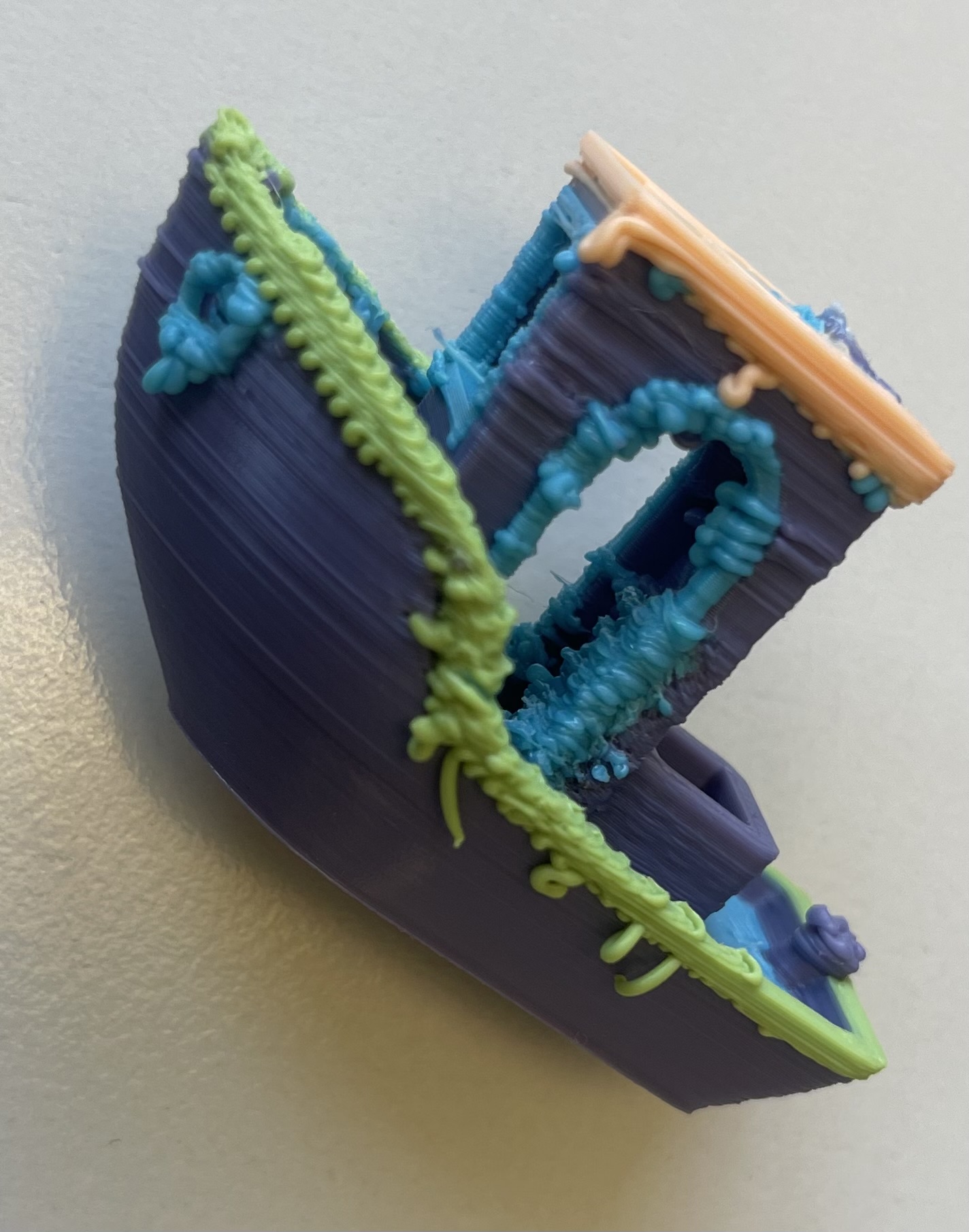 Die Technik ist günstig und funktioniert zuverlässig, ist je nach Einsatzzweck aber langwierig und verschwenderisch, da im Extremfall auf jedem Layer mehrere Farbwechsel samt Spülvorgang stattfinden. Zum Test haben wir mehrfach vierfarbige Benchys gedruckt. Das eigentliche Modell kommt auf ein Gewicht von 12 Gramm, aber das Zehnfache dieses Filaments wurde „gespült“ und somit als Abfall entsorgt – und die Druckzeit verlängert sich extrem. Für Modelle mit wenigen Farbwechseln eignet sich das Prinzip hervorragend. Zudem ist es komfortabel, mehrere Filamente im Drucker einsatzbereit zu haben und je nach Bedarf mit PLA, ABS oder TPU zu drucken.