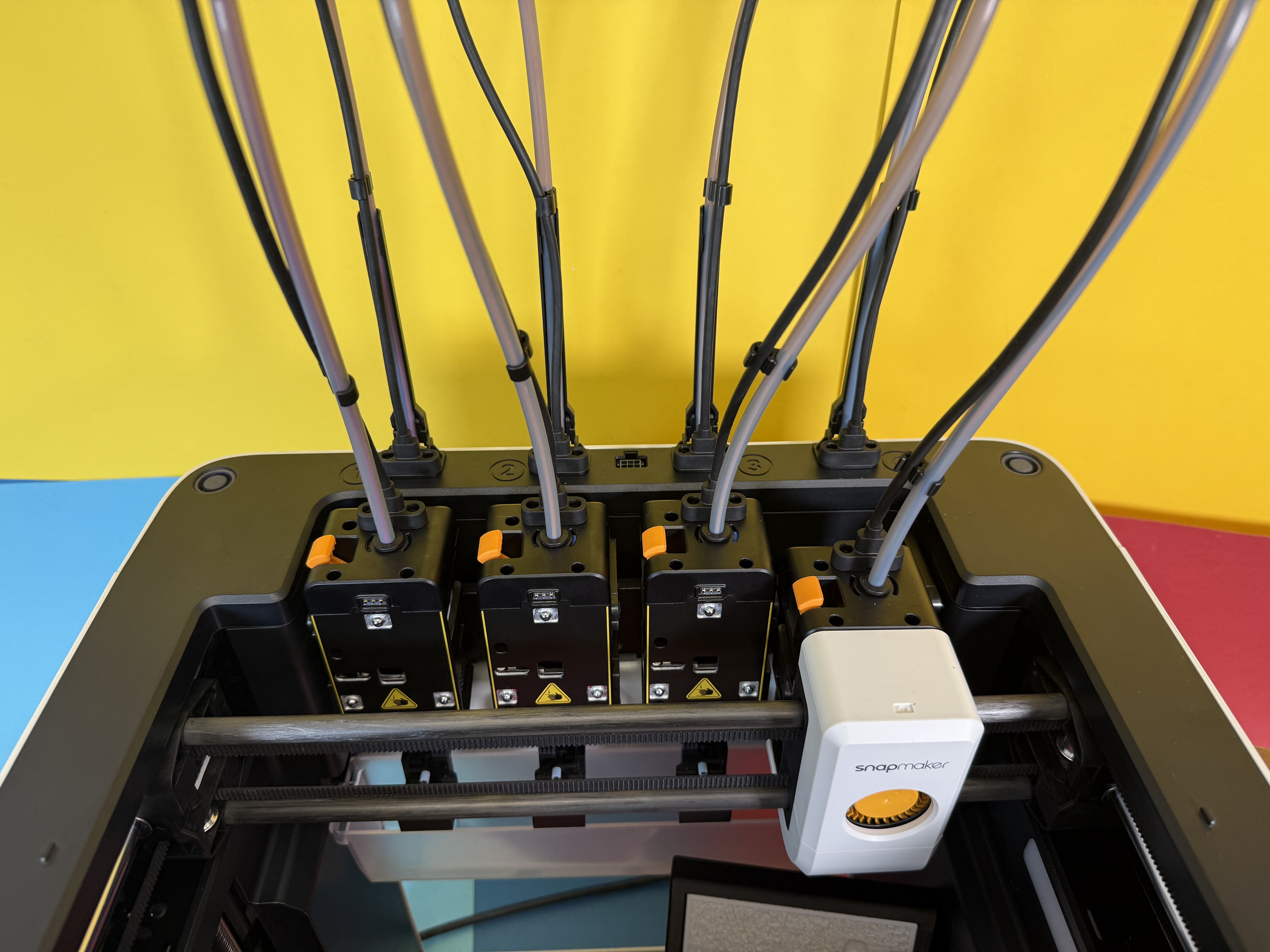 Der Snapmaker U1 hat vier Druckköpfe mit eigenem Hot-End und Extruder-Antrieb. Jeweils ein Druckkopf ist im Einsatz, die anderen werden hinten im Drucker geparkt. heise bestenlisten