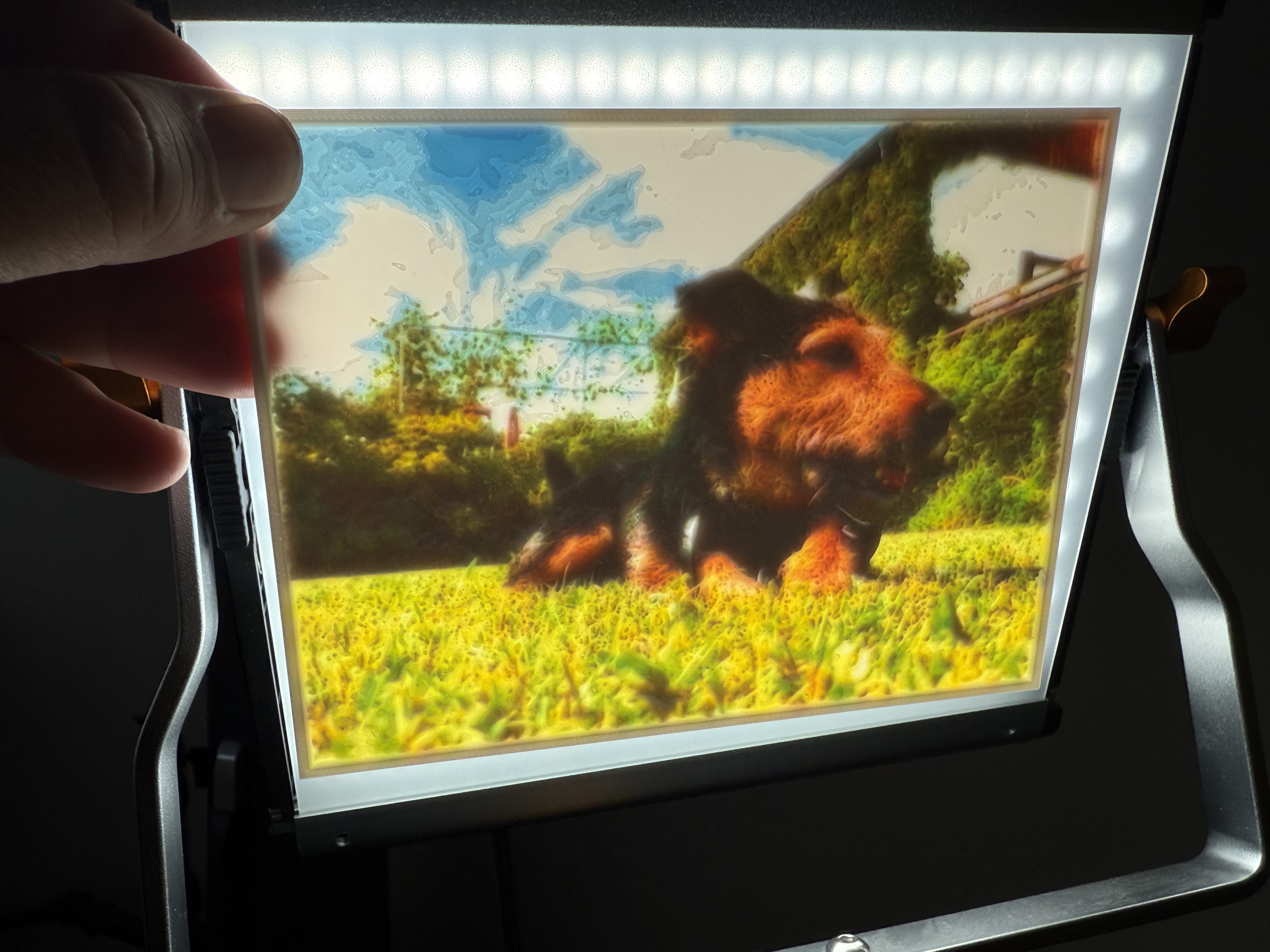 Wird das Lithophane von hinten beleuchtet, erscheint ein Farbfoto. Je dicker das Material, um so dunkler wird es, die Farben werden aus den CMYK-Punkten zusammengesetzt.