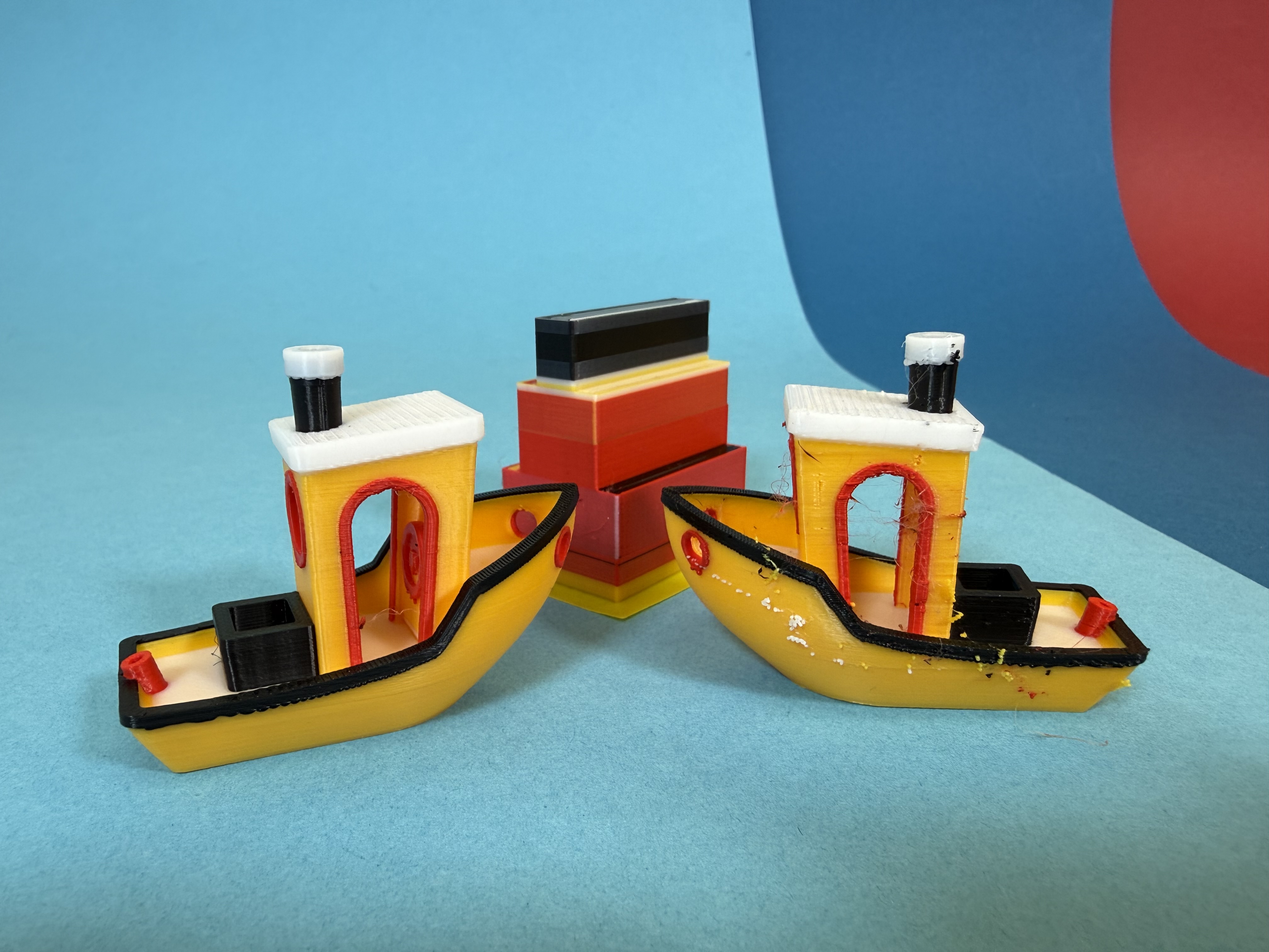 Zum Vergleich: Das linke Benchy haben wir mit dem Bambu AMS auf dem P1S gedruckt, das rechte auf dem Snapmaker U1. Gerade das Benchy verlangt aufgrund seiner vielen schiefen Ebenen viele Farbwechsel. Der Drucker muss fast die zehnfache Menge Filament aus Abfall auswerfen, als das eigentliche Druckobjekt wiegt. Das rechte Benchy haben wir auf dem Snapmaker U1 mit Werkzeugwechsler gedruckt, hier fällt fast kein Abfall an.