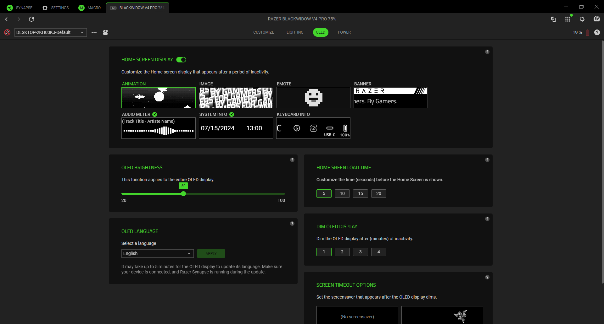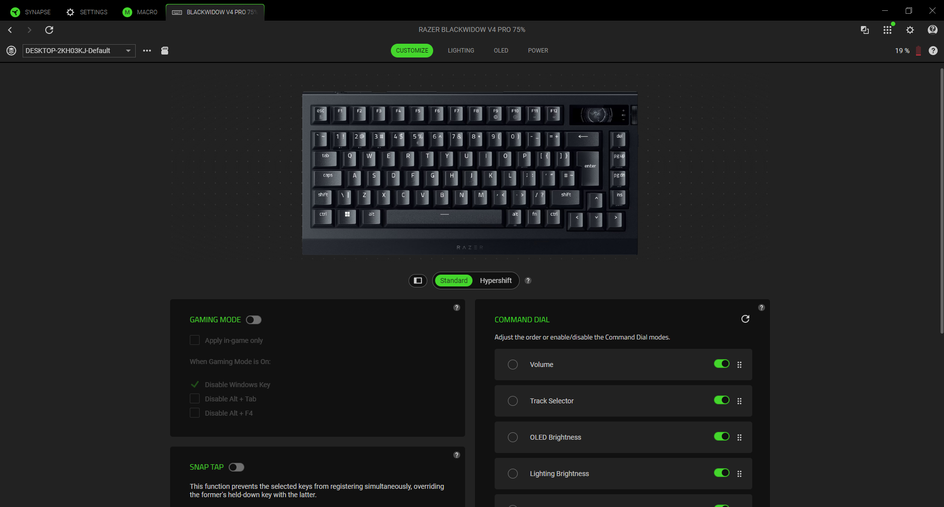 Um die Blackwidow V4 Pro 75 zu konfigurieren, steht die produktübergreifende App Razer Synapse am Start. Mit ihr konfiguriert man die Tastenbelegung des Keyboards, die Beleuchtungseinstellungen, die OLED-Anzeige und die Stromsparfunktionen.