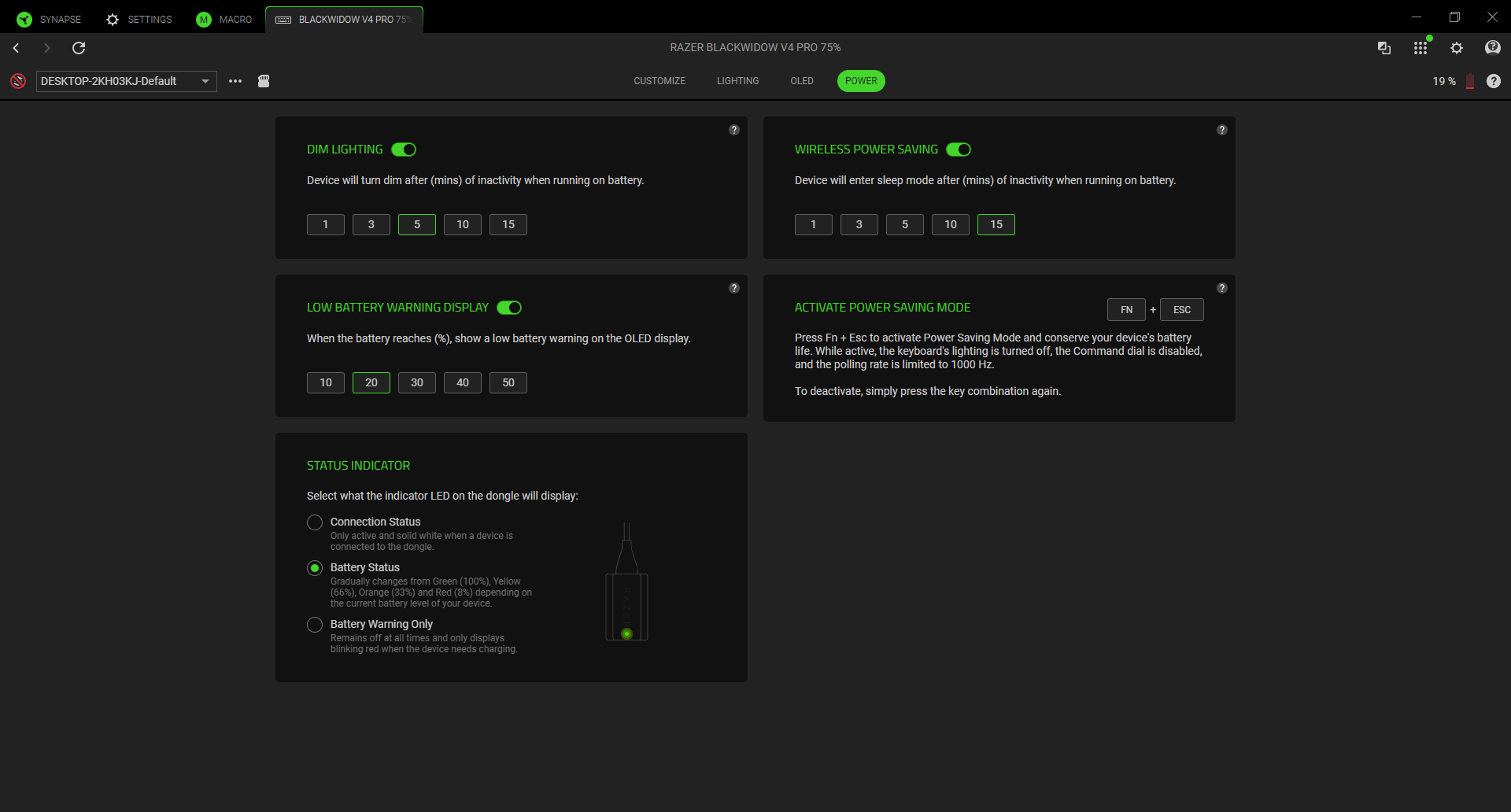Der 4200-mAh-Akku der Blackwidow schwächelt leider stark und ist selbst mit auf 50 Prozent heruntergeschraubter Helligkeit des OLED-Displays und der RGB-Beleuchtung nach gut 5 Stunden schon zur Hälfte leer. Razer verspricht bis zu 2100 Stunden mit einer Akkuladung, wenn man den Energiesparmodus per Fn- + Esc-Taste aktiviert. Dieser deaktiviert allerdings den OLED-Bildschirm, die Beleuchtung und den Zugang zu den Software-Einstellungen. Der schwächelnde Akku wäre auch nicht ganz so tragisch, wenn man durch Anschließen des Ladekabels nicht auf die 4000-Hz-Abtastrate verzichten müsste.
