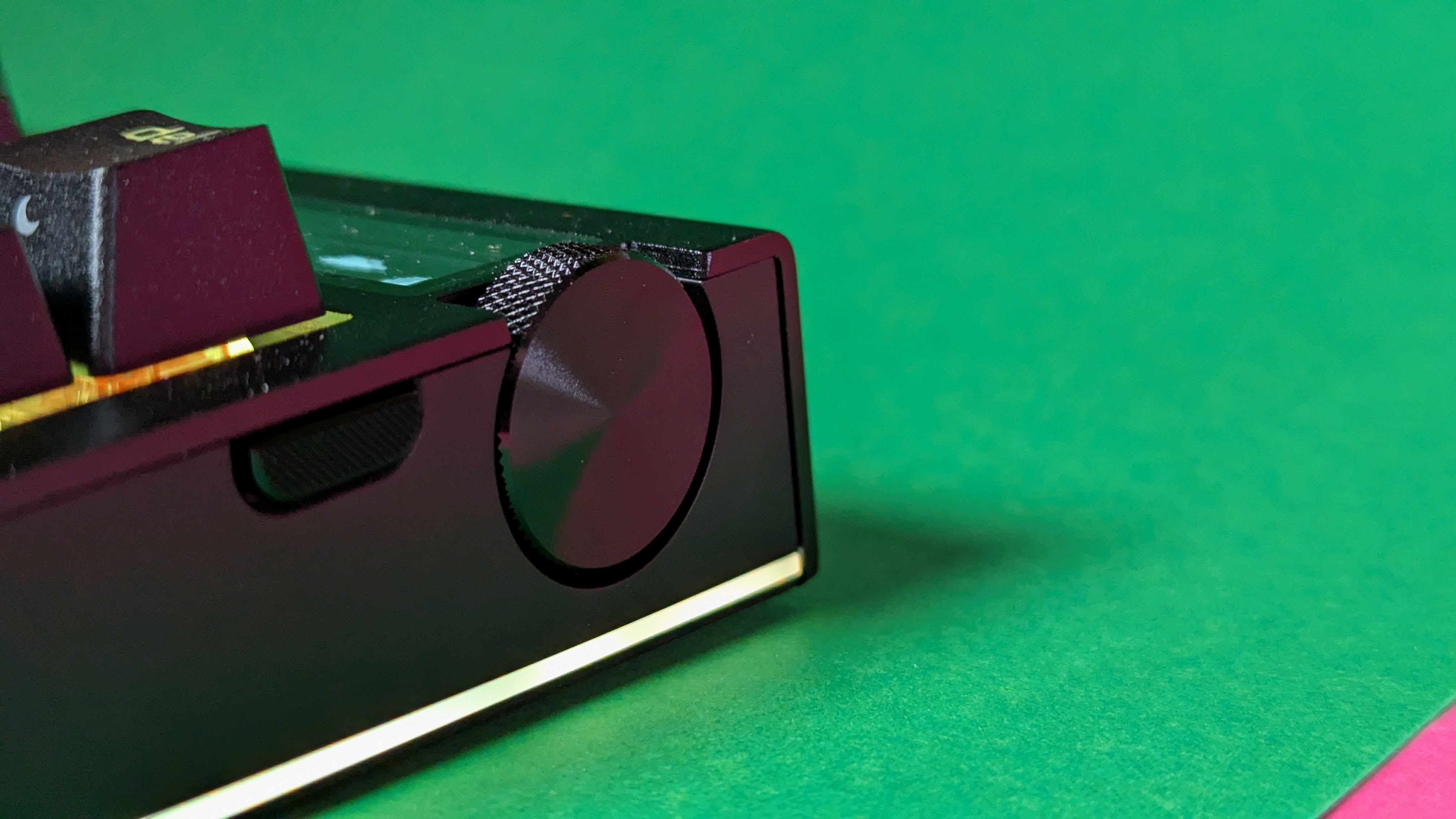 Zusätzliche Bedienelemente wie der Verbindungsmodusschalter hinten an der Tastatur, das Scrollrad sowie der daneben positionierte Modus-Button sind ebenfalls aus Aluminium und mit einer geriffelten Textur versehen. Diese verleiht Griffigkeit, sammelt dank der rauen Beschaffenheit aber auch sofort Hautpartikel.
