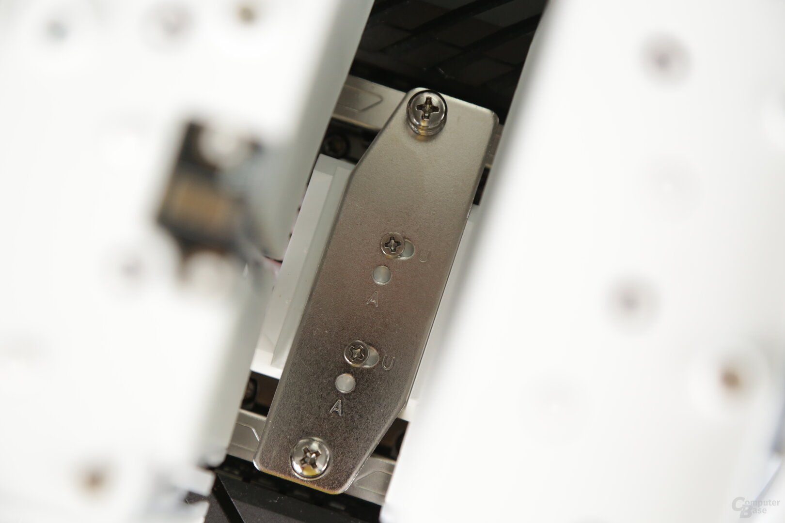 Dabei kann über die Kühler-Halterung der Offset zum Retention-Modul eingestellt werden, je nachdem, welcher Sockel verwendet wird. Ab Werk ist LGA 1700/AM4 konfiguriert, für LGA 1851 wird auf „U“ (Core Ultra) und für Sockel AM5 auf „A“ (AMD) umgestellt.