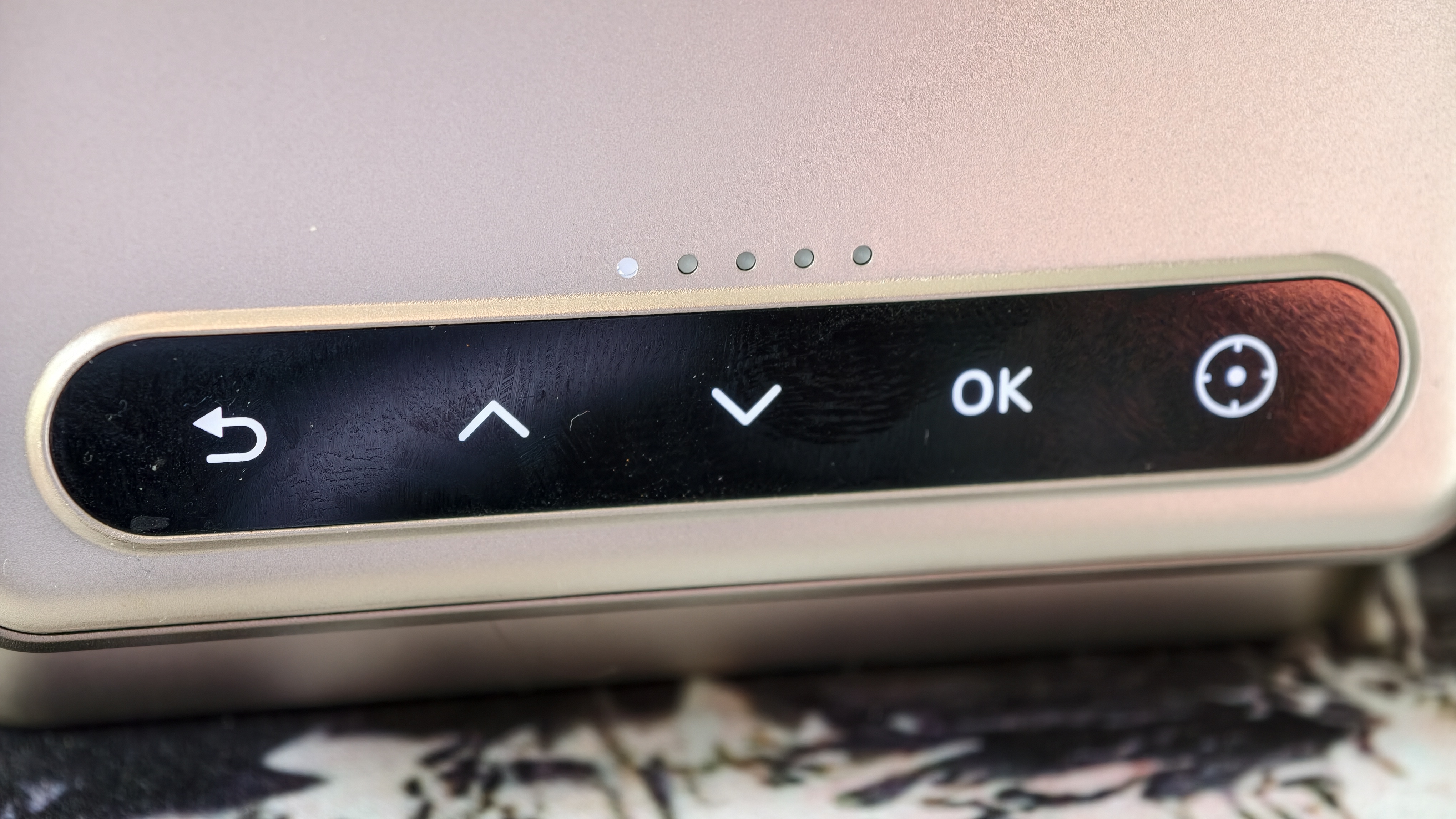 Die Bedienung erfolgt über fünf beleuchtete, responsive Touch-Buttons direkt am Gerät, ergänzt durch drei klassische physische Tasten für Power und Lautstärke. Außerdem reduziert ein Schiebeschalter auf Wunsch die Helligkeit. Das minimalistische On-Screen-Menü beschränkt sich auf essenzielle Einstellungen wie Sprachwahl, Trapezkorrektur und Verbindungsoptionen. Die Menüführung ist selbsterklärend.