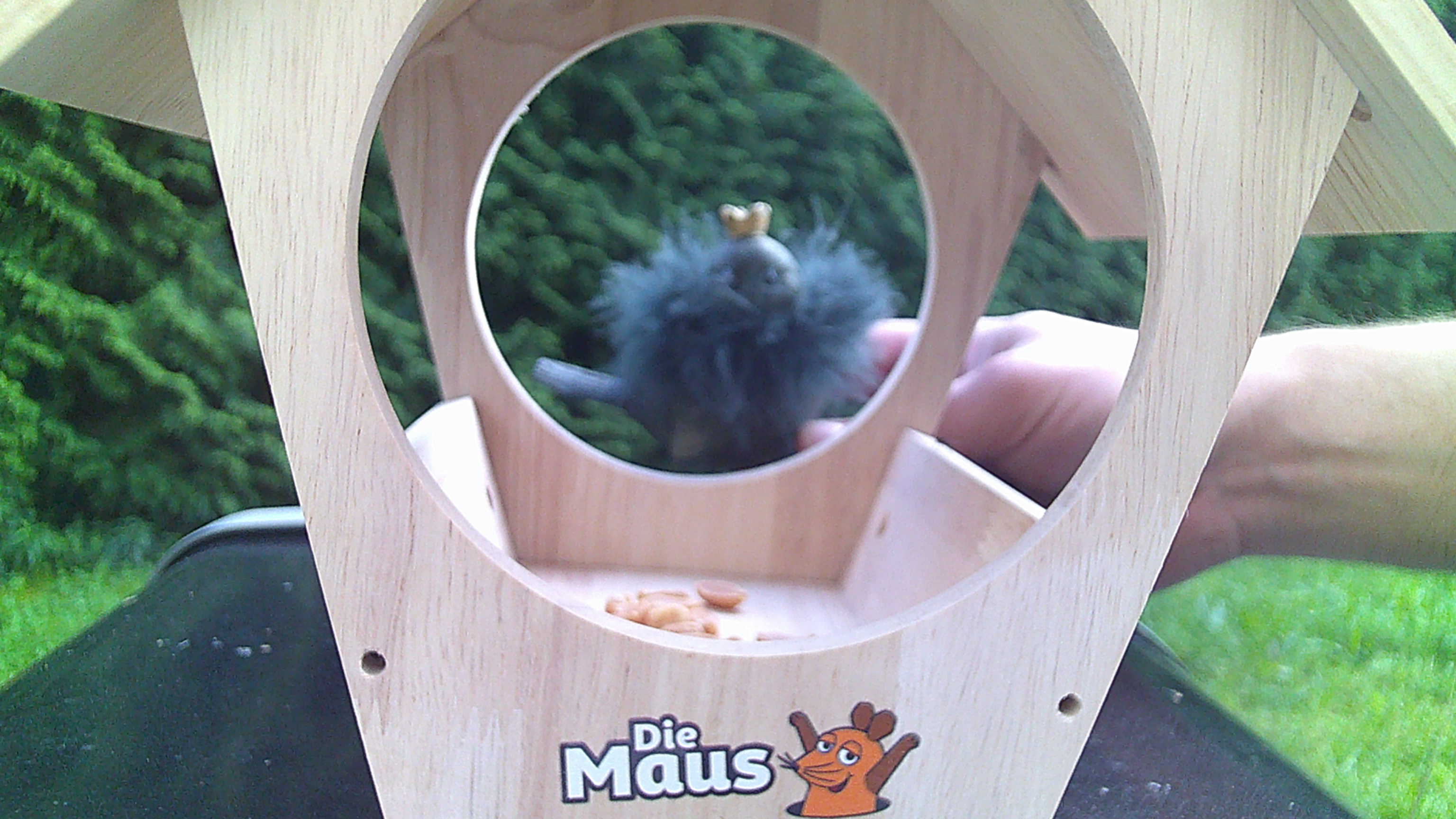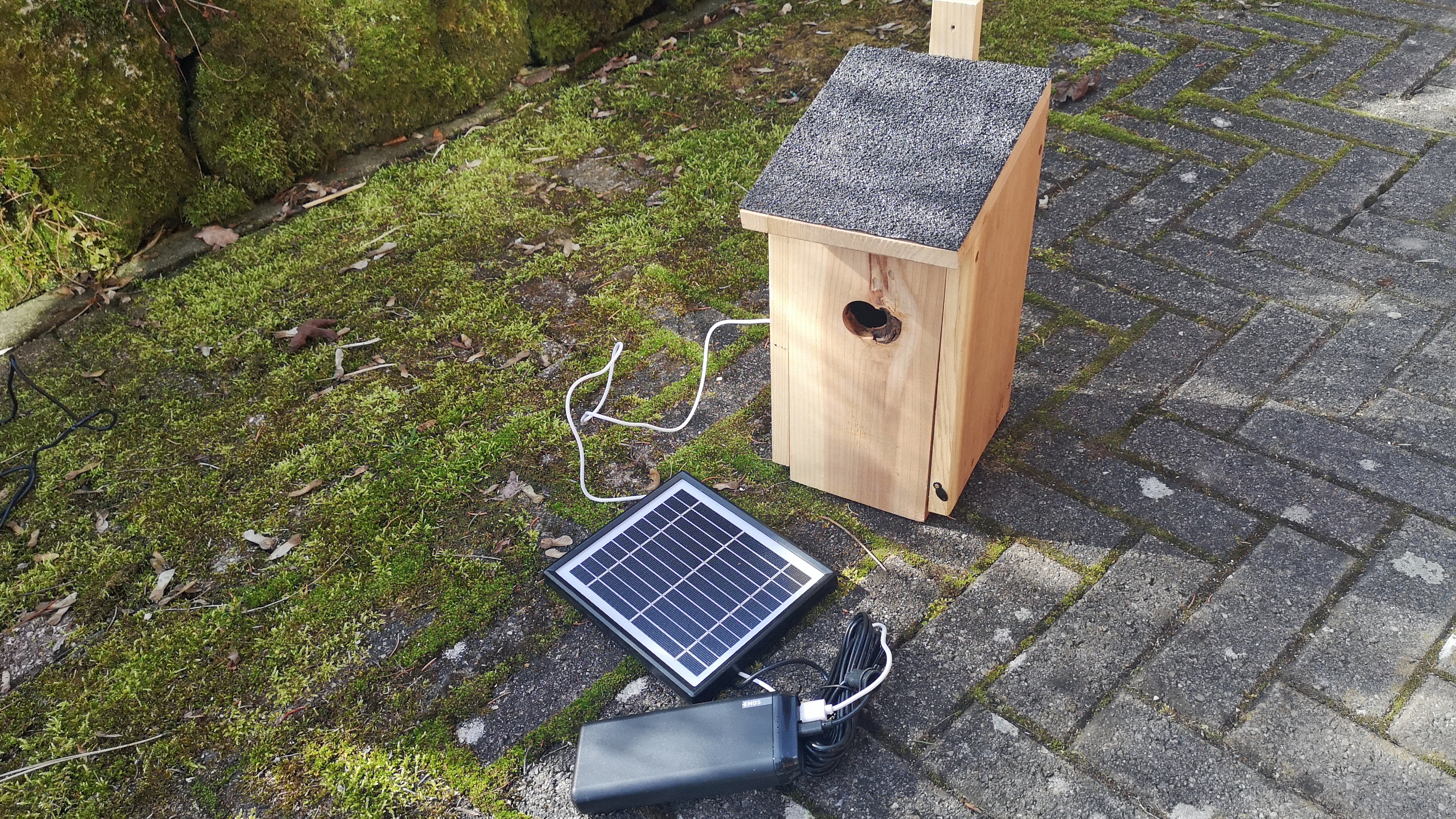 Hier hatten wir das Panel unter einer Plexiglasscheibe auf der Oberseite des Nistkastens befestigt. In der Praxis muss der Kasten dann aber voll in der Sonne hängen, damit die Stromversorgung funktioniert. Externe Panels mit langer Zuleitung sind besser geeignet.