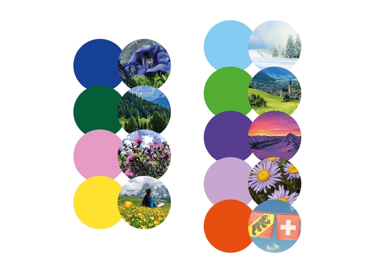In Rosa- und Blautönen, im kraftvollen Grün oder Orange, die von der Region selbst abgeleitet sind, von dem hellen Winterhimmel, den Bergwiesen, Pflanzen und Landesfarben.