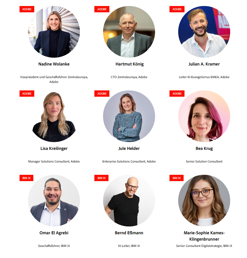 Zu den Sprecher:innen zählen unter anderem Nadine Wolanke (VP & Managing Director Zentraleuropa, Adobe), Hartmut König (CTO Zentraleuropa, Adobe) und Julian A. Kramer (Leiter KI-Evangelismus EMEA, Adobe) sowie Omar El Agrebi und Bernd Eßmann von IBM iX.