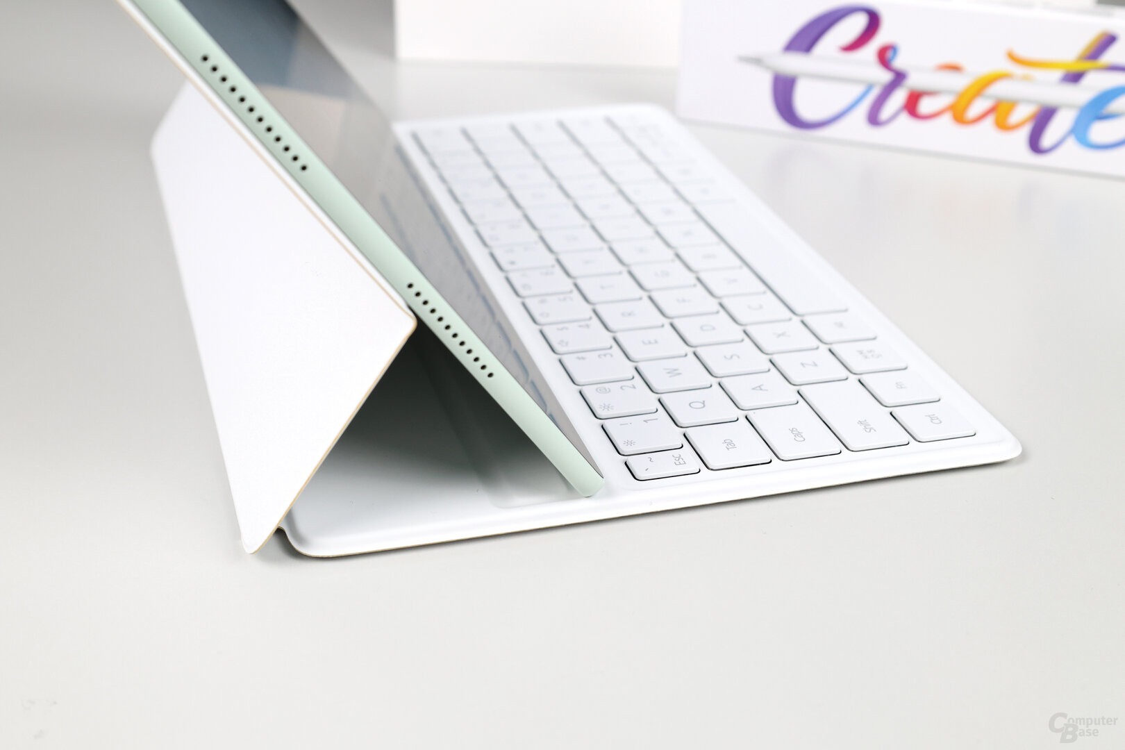 Das Smart Magnetic Keyboard, so der Name der Tastatur, verfügt nicht über ein Touchpad, bietet aber eine Chiclet-Tastatur mit Scherenmechanik und 1,5 mm Tastenhub. Die Tastatur und das Back-Cover sind ein einziges Stück, lassen sich also nicht getrennt voneinander aufstellen. An der Tastatur sind zwei Kerben, über die der Winkel des Tablets justiert werden kann. Der Stift verbleibt am Tablet und wird nicht wie beim Glide Keyboard des MatePad Pro 12.2 zwischen Tablet und Tastatur verstaut.