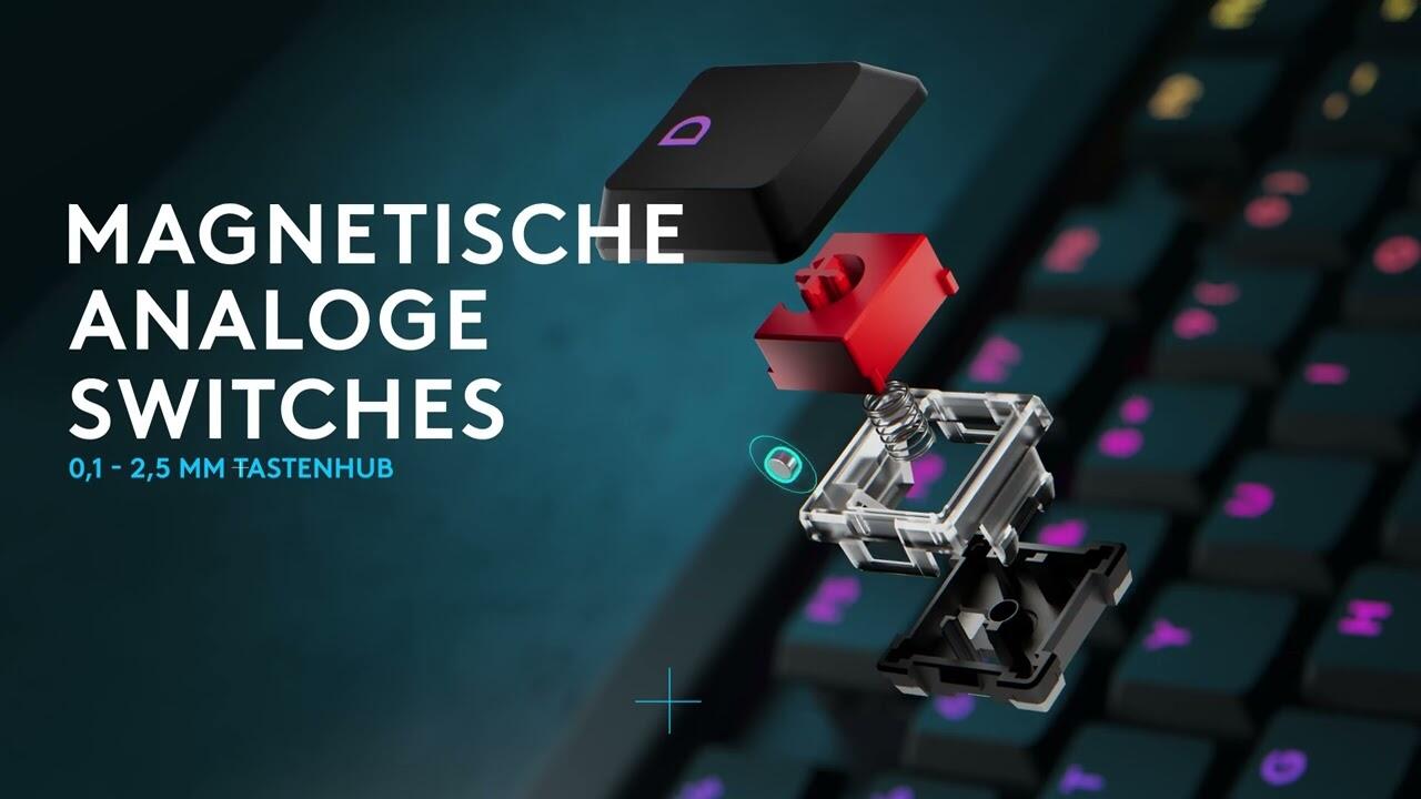 Im Gegensatz zu den Kailh Choc V2, die Logitech sonst für die G515 zukauft, weisen die neuen analogen Taster einen nochmals verkürzten Hub auf, der von 3,2 auf 2,5 Millimeter sinkt. Der Auslösewiderstand soll bei 35 Gramm liegen, was eher der Eingangswiderstand ist. Wann eine Eingabe generiert wird, kann aufgrund der Technik ab 0,1 Millimeter Wegstrecke nach eigenen Maßstäben eingestellt werden.